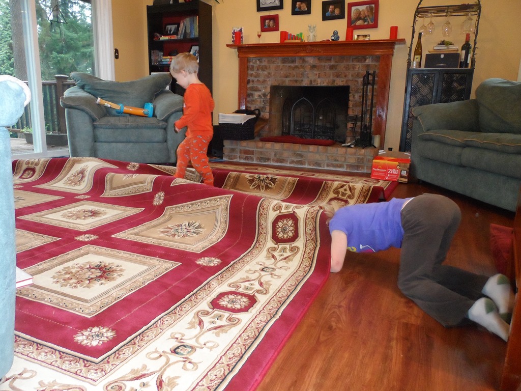 Later that day, they stripped their pillowcases and became ghosts, unhatched baby birds, and ocean swimmers. I’m going to buy Wesley some more toys for his birthday so maybe they will leave the living room rug alone….