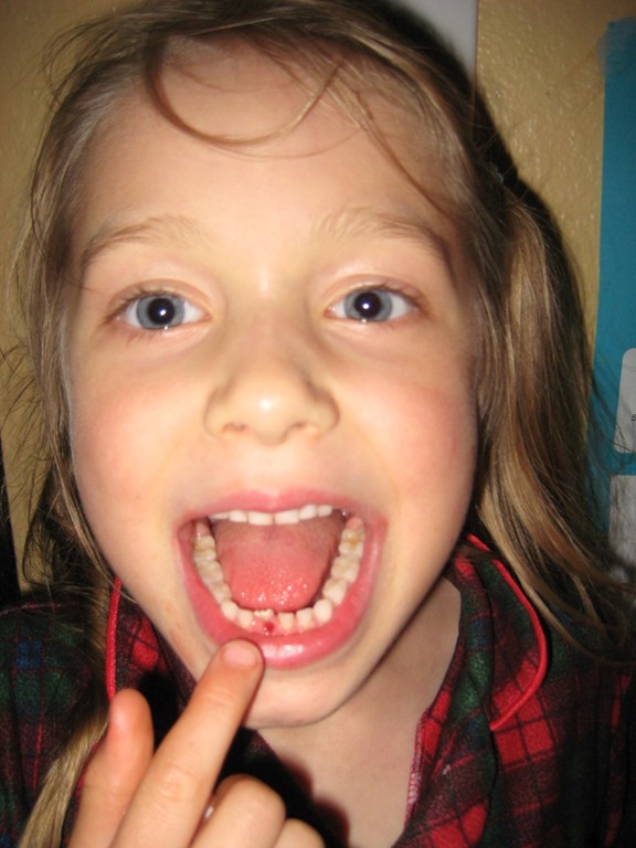 Little Miss Shark Tooth finally lost that baby tooth! It was very exciting. She came downstairs late at night, blood dripping down her mouth, very excited that she had almost gotten it out. I asked her if she wanted me to take it out and she was so excited she hopped up and down. I yanked it out and Kyla couldn’t have been happier…or braver.