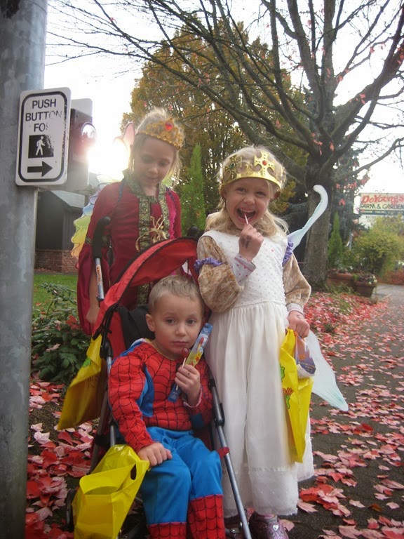 I managed not to have any pictures of myself. I have a purple dress that is a twin to Kyla’s and a crown that is identical to Piper’s. Wesley was both Spiderman and a dragon-dinosaur today.
