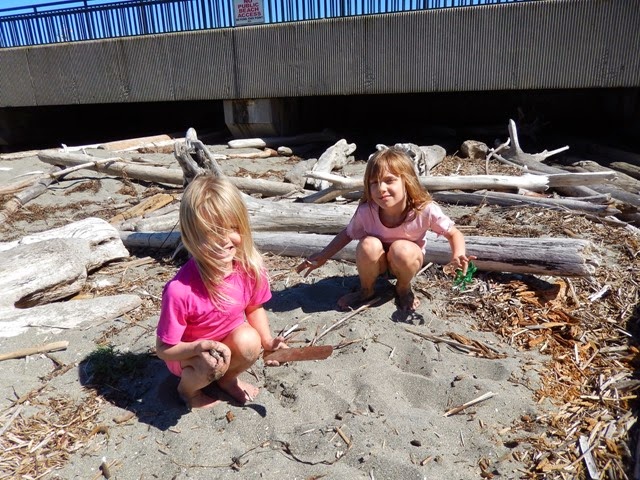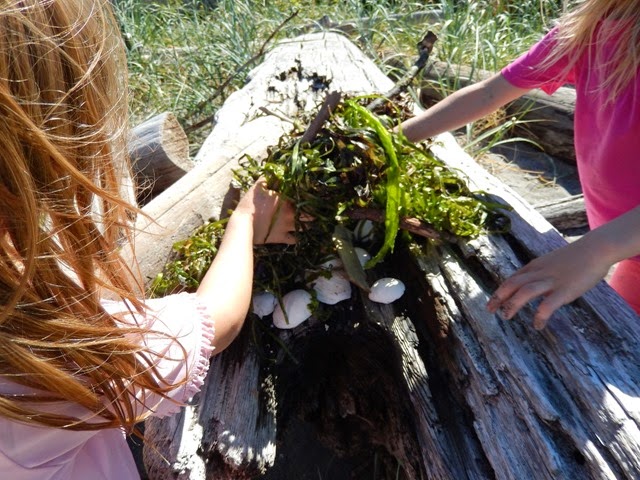 Piper declared that she wasn’t going to touch the sand at all and vowed to not have any fun (she didn’t get to go to the beach she wanted—these deprived children have at least 4 good beaches to chose from close to the cabin). That lasted until she was ignored long enough and then she and Kyla built their own beach house out of drift wood, seaweed, and shells.