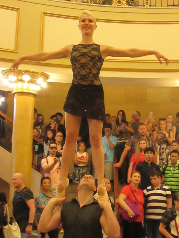After the show, we dawdled so I could take some pictures. When we went out into the lobby, a crowd had formed around a team from the show. She is standing en pointe (on her tippy toes) on his shoulders!