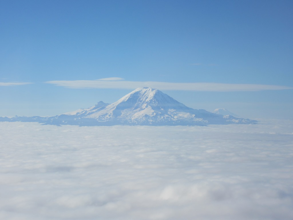 This is how our flight began, breaking through the clouds to see Mount Rainier looking like an island through the clouds. Daddy was already snoozing by this altitude, so he missed it.