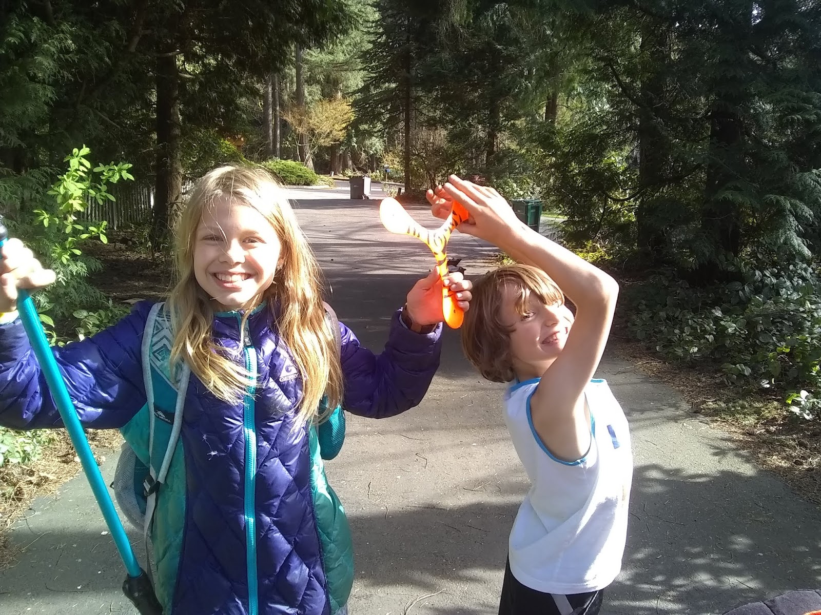 You may remember our earlier misadventure with Wesley’s boomerang last July. Even after all the weather we’ve had since then, it was still firmly stuck in that fir tree. In an effort to distract Wes from throwing rocks when I wasn’t watching (yeah, that cerebral cortex of his wasn’t up for the task), I got out our Little Giant Ladder, and got up as far into the tree as I could. Then taking the water extension wand, I pulled it as long as it would go, then javelin-threw it from the ladder to the branch, still several yards away. Over and over.