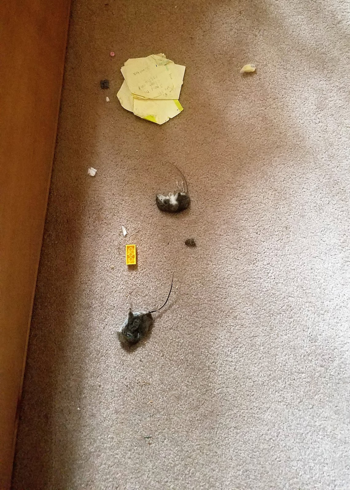 In a new feline low, one of the cats brought in a dead mouse. A very, very dead mouse. So old that maggots were crawling out of it and making their way up Wesley’s book case and across the carpet.