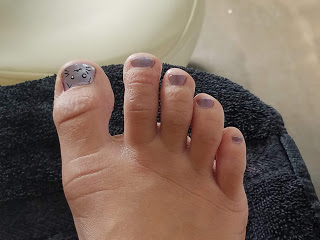 And here’s her pedicure. The cat faces are a perfect touch for her.