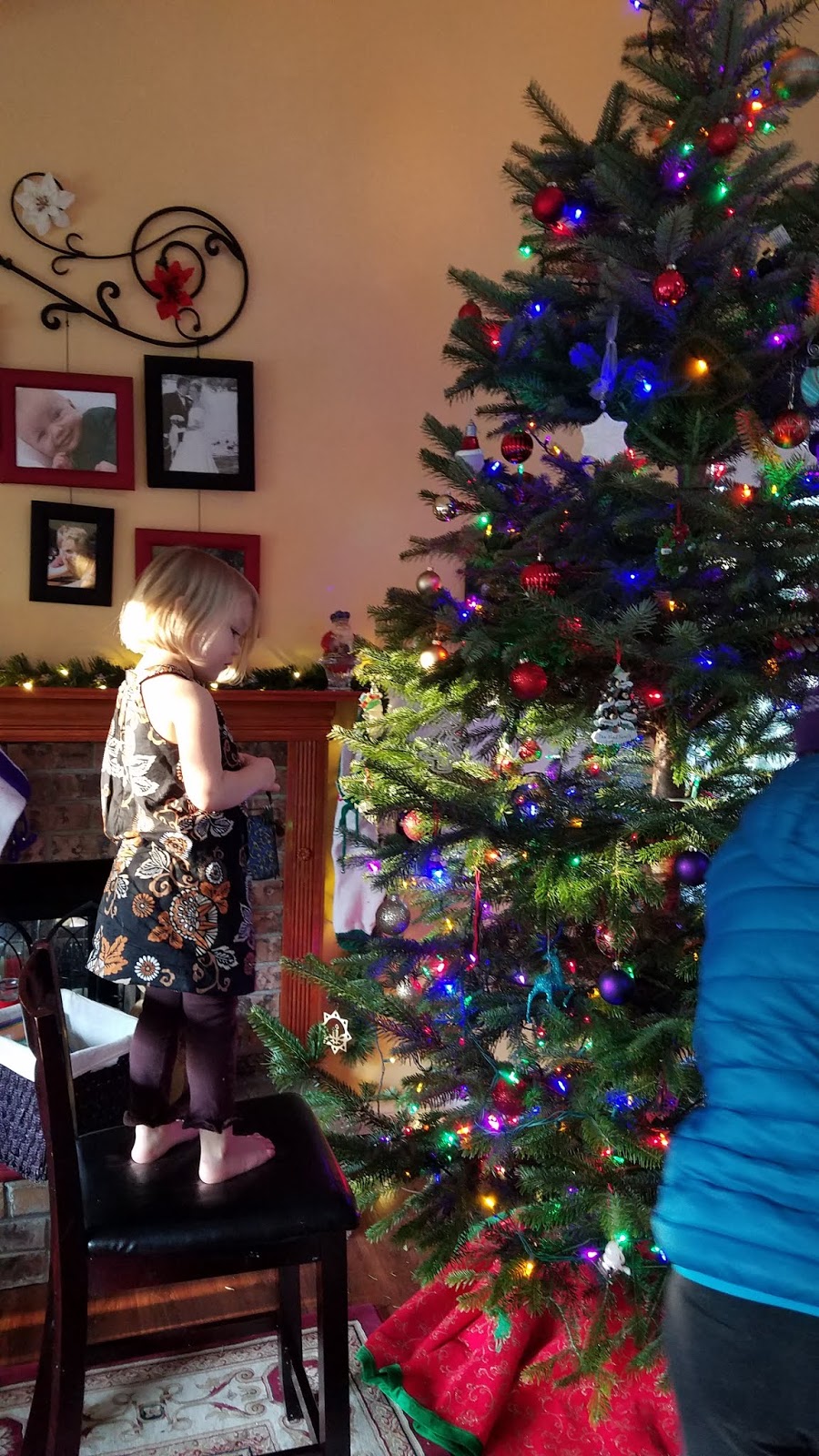 After watching her cousins scramble up and down, Amber worked up to standing on the “tall chair” to hang decorations herself.