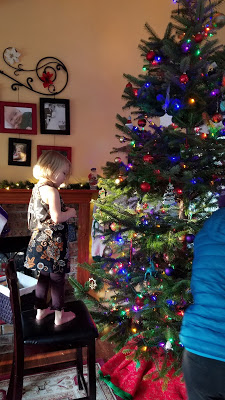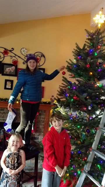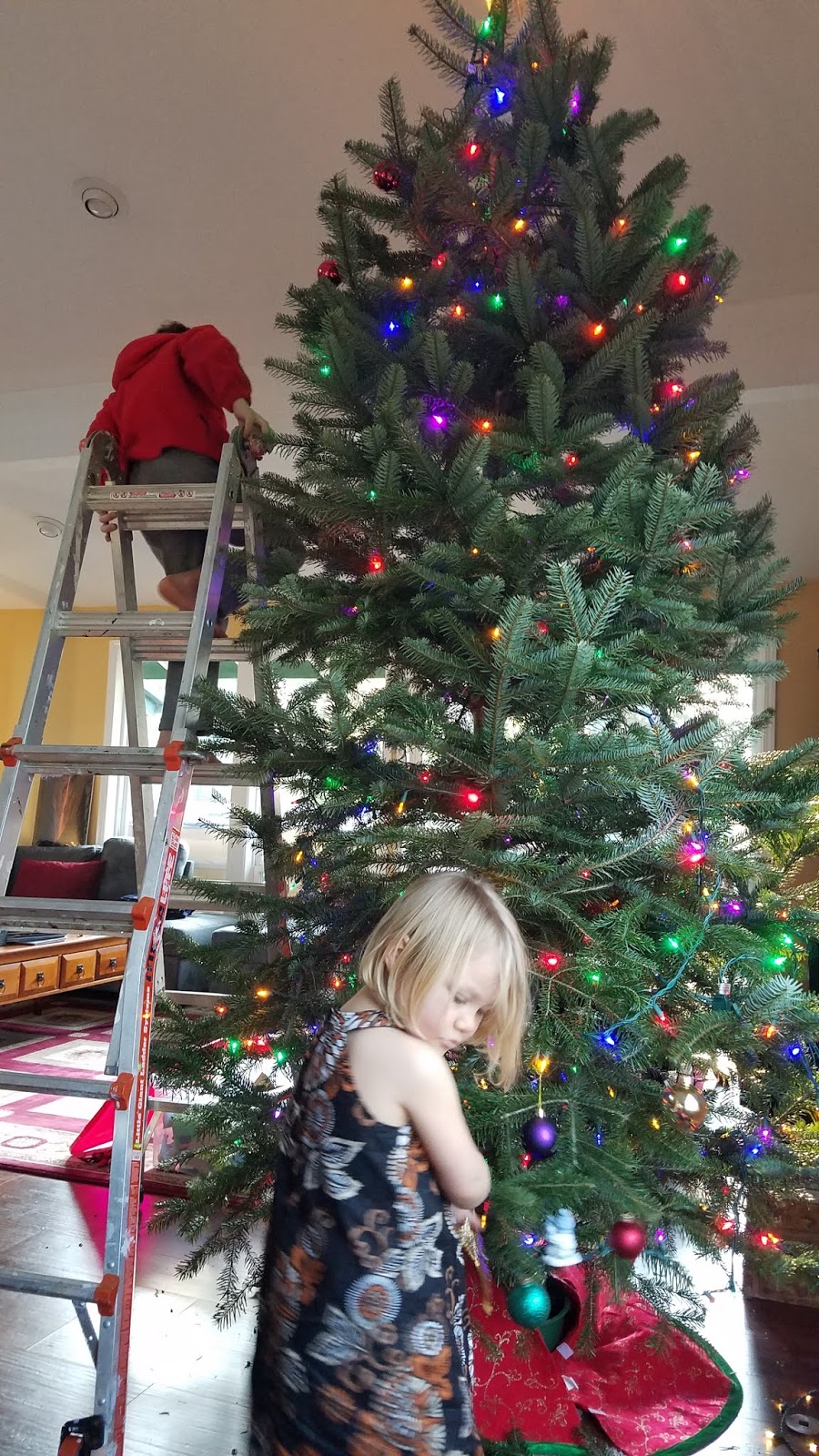Amber came back with Auntie Denise to help decorate our kill, and to give Lil Sis a chance to nap undisturbed. She was quite the helper. (Kyla waited until later to relocate the 5 ornaments on two branches, fully willing to believe that she and her siblings had all done the same.)