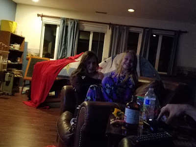 In the background is a common landscape in our basement–Wesley’s new improvements on blanket-forting. Notice the total lack of access to the fire place and three-quarters of the room. I’m kinda over it. But when he hates to do schoolwork, sometimes he can be convinced to take it downstairs and work on it happily in his cave.