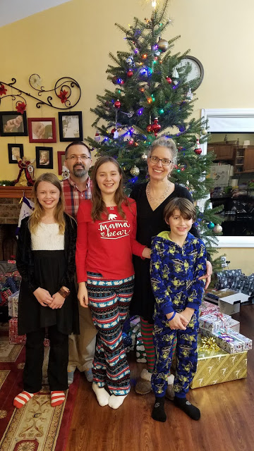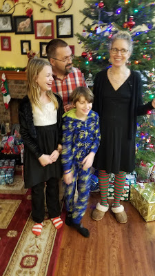 We followed it with a cup of tea and Christmas cookies (Dwayne’s first this year!) and some present opening. This first picture those is a hoot: I asked for a family picture in front of the tree and Dad started snapping while Mom decided to try out Frederick, Wes’s balance ball.