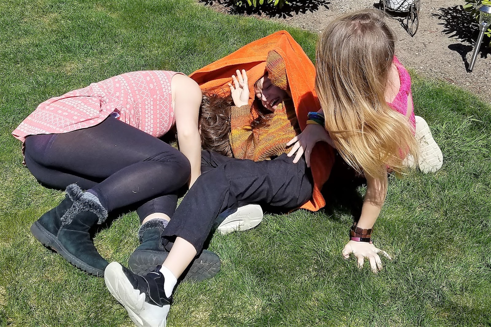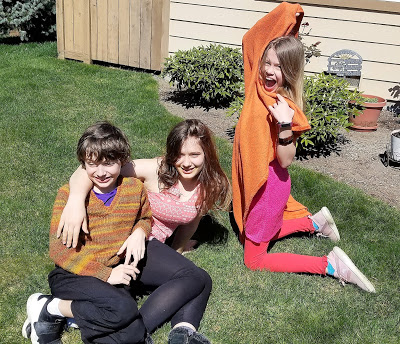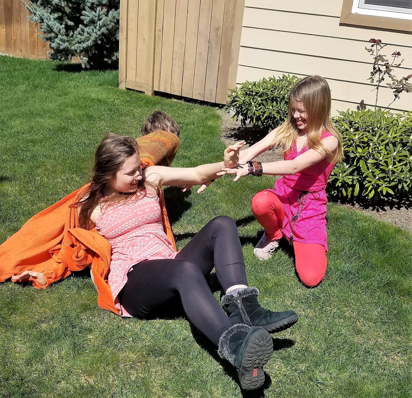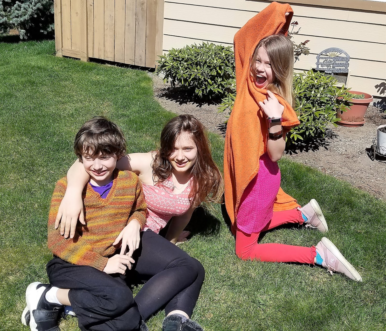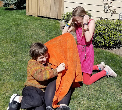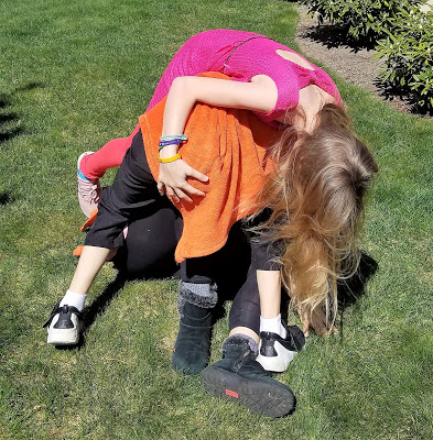 While we were still dressed up (yes, Wes considers himself well dressed in black polyester pants–because they are uncomfortable enough to be dressy, but not torturous like, gasp!, jeans–and the sweater Grandma knitted 4 or 5 years ago), we brought fresh bouquets to my aunt’s homecare and we were able to wave and shout hello from the sidewalk. Then we did the same for my parents, but got to stay much longer chatting from the lawn to the front porch. Grown ups are invariably boring, so my feral children wrestled together, much like I picture young wombats would intoxicated on spring sunshine.