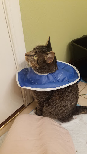 Piper’s cat, Timmy, had a close call with death by UTI last weekend, and while he seems to have passed the tipping point of recovery, he is down to approximately half a life now. He had a mucus plug in his urethra and the catheter insertion failed, so they chose Route 2, which is to go in through the bladder and down the urethra that way. After a few nights at the vet’s (because I refused to pay the thousands an emergency animal hospital overnight would cost), we brought him home with lots of pills, a collar of shame, and a catheter sutured to a tube sutured to him that was warned not to pull out.