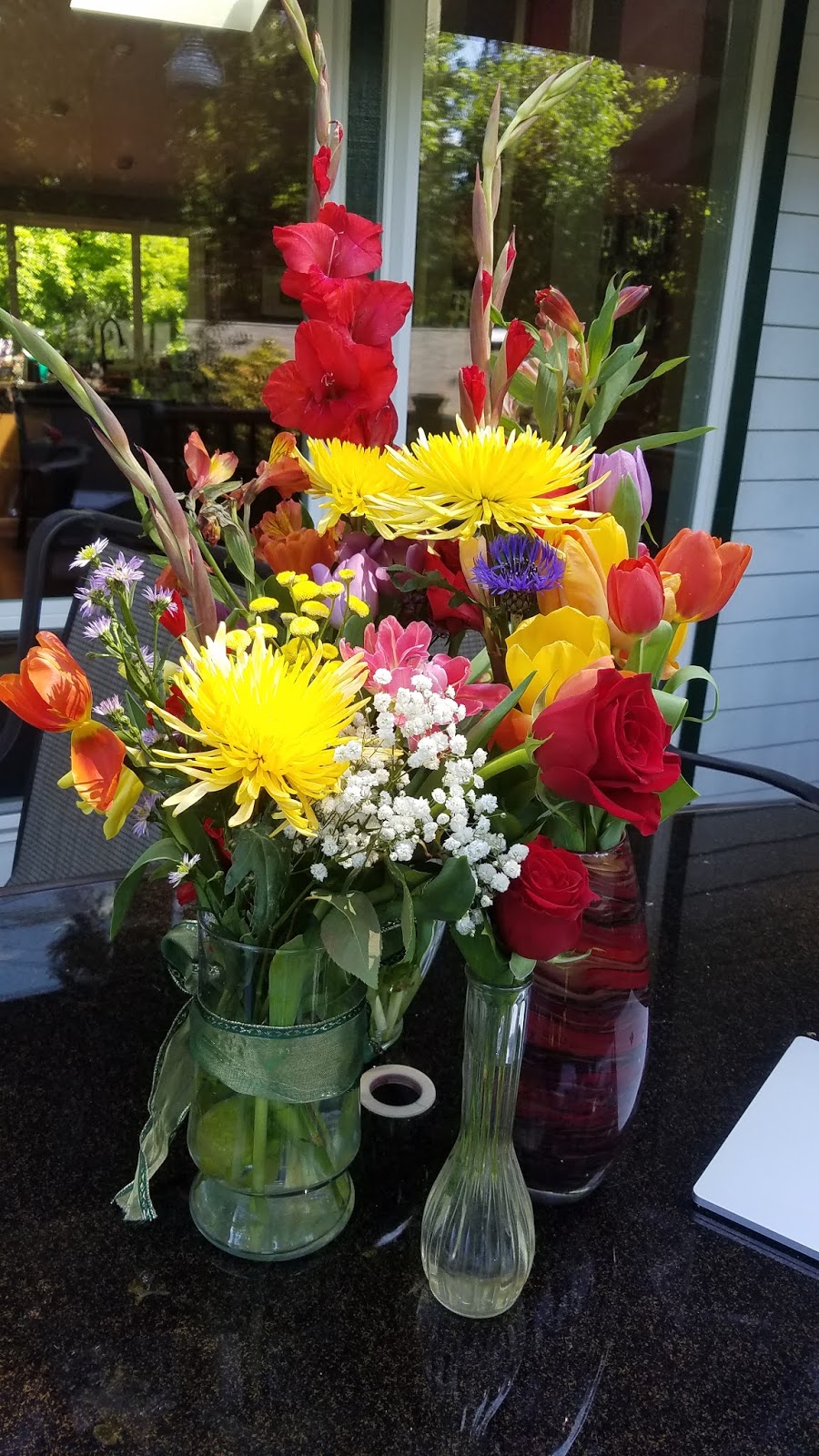 Piper spent all afternoon cooped up in the tiny, stuffy tiled bathroom to care for our leaky patient, preventing him from pulling it out several times before he finally got it out. In retrospect, it was better he had done it then than later when we made her eat dinner or sleep in her own bed. She has been an amazing caretaker, and if he pulls through, it will be her consistent and sacrificial care that makes the difference. She’s coping GREAT with the emotional roller coaster, but well, it’s an emotional roller coaster. I lost a lot of sleep over this, mostly because I abhor spending that much money on a pet, and deciding whether or not to kill your daughter’s pet is not as easy as it seems. I resent dealing with vet because, not only am I at the mercy of my own ignorance, but there also seems to be an underlying assumption that money is no object in saving the life of a pet. By Day 2, I finally figured out a strategy. Whenever I heard, “Now we’ll have to …. and it will cost …”, I would reply, “We can’t pay that. How much will it cost to have him euthanized right now?”. Then a Plan B would be presented that was slightly more reasonable.I learned a few more lessons that I hadn’t been looking for over this last week. 1) I’m quite good at giving Timmy pills and making him swallow. 2) When a cat has a catheter, kitty litter needs to be avoided to keep the bits from going up, well, bits. I’ve shredded many newspapers these last few days. 3) Now that Timmy isn’t allowed to have dry food (UTI, um, yay), that’s what he wants to have, not the expensive canned food he’s supposed to have. 4) I don’t have to love a cat to lose sleep over him. And I certainly don’t have to like a cat to spend too much money on him. Use that half-life well, TimmyCat.Then, Dwayne took Wes downtown to purchase armfuls of flowers, and the kids arranged them and surprised me with riots of colors.
