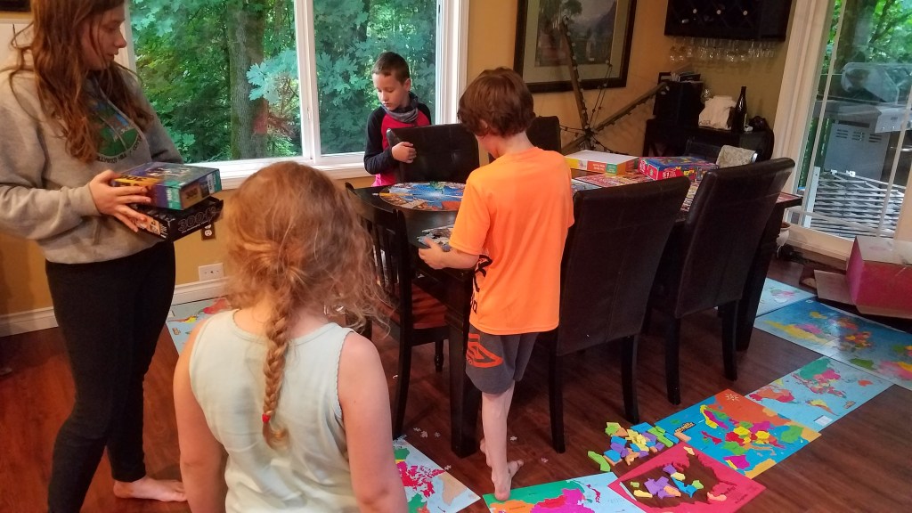 Kyla started doing her puzzles when school ended and didn’t stop until every puzzle in the house was completed and covering the dining room. Then I promptly ordered her a few 3D puzzles and a 2,000 piece puzzle.