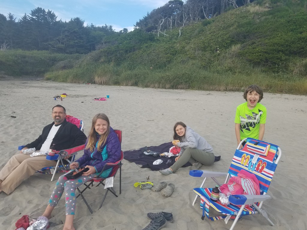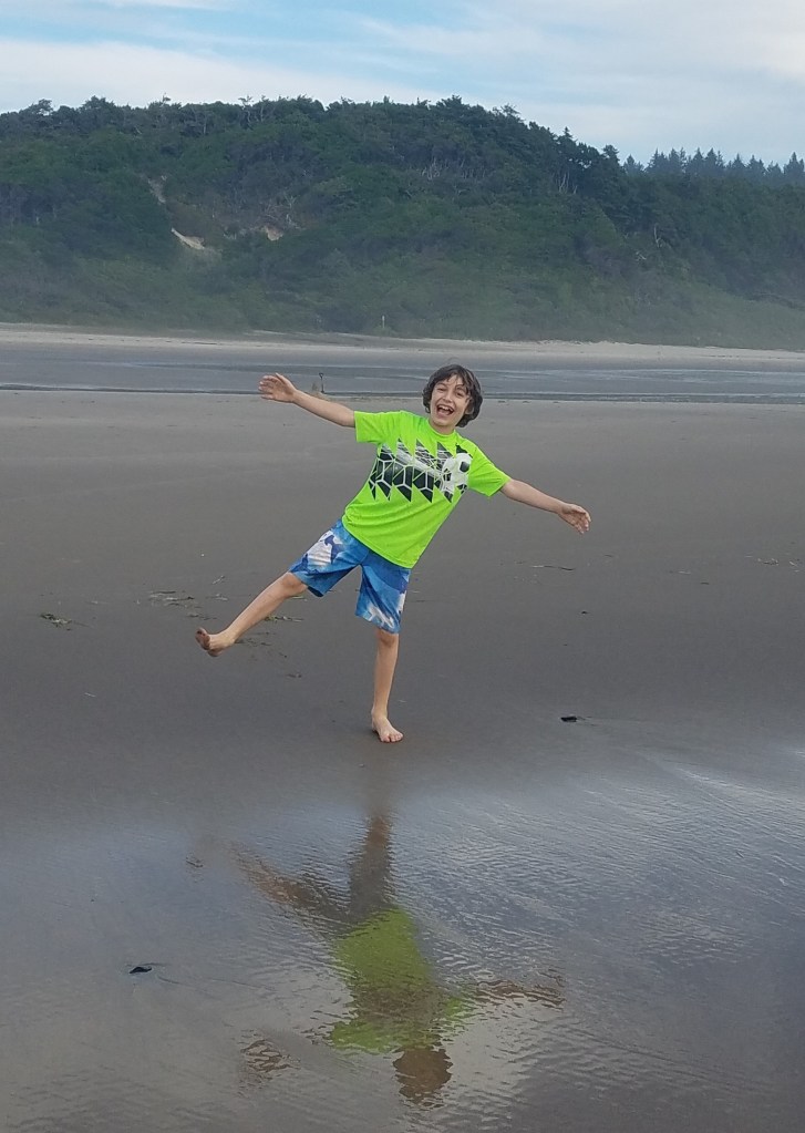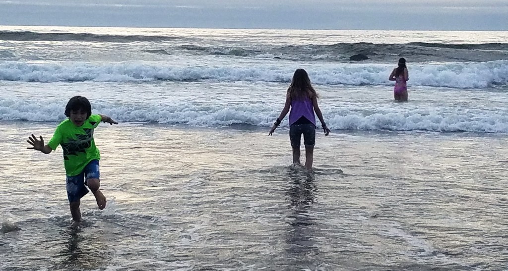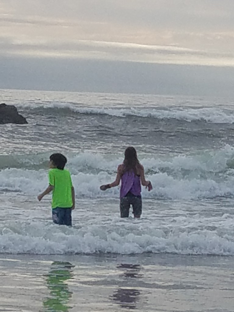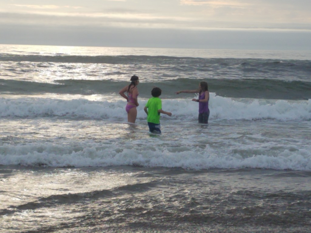 When we arrived at the Thousand Trails campground, we took our few minutes to set up camp, threw together a picnic dinner and headed over the highway to our first steps in Oregon sand. Oh, how we love the beach! I ran with the kids straight for the water, but with more experience than enthusiasm, I stayed dry north of my ankles. The kids dashed in and out, and Kyla just dove straight into the waves, as a powered glider did tricks for us to my enthusiastic waving.