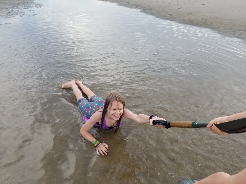 Mama Duck stayed near until all the kidsicles came out and buried themselves in cool towels, warm sand, and hot sandwiches. Wes just stuck his hair right into the sand to immediately dissolve any hope I would ever have of not cleaning out sand from the trailer for the next 8 years we will own it. Luckily, we have an outdoor shower, and I quickly set up a head-to-toe cleaning system before any of them were allowed in to collapse in exhaustion in their bunks.