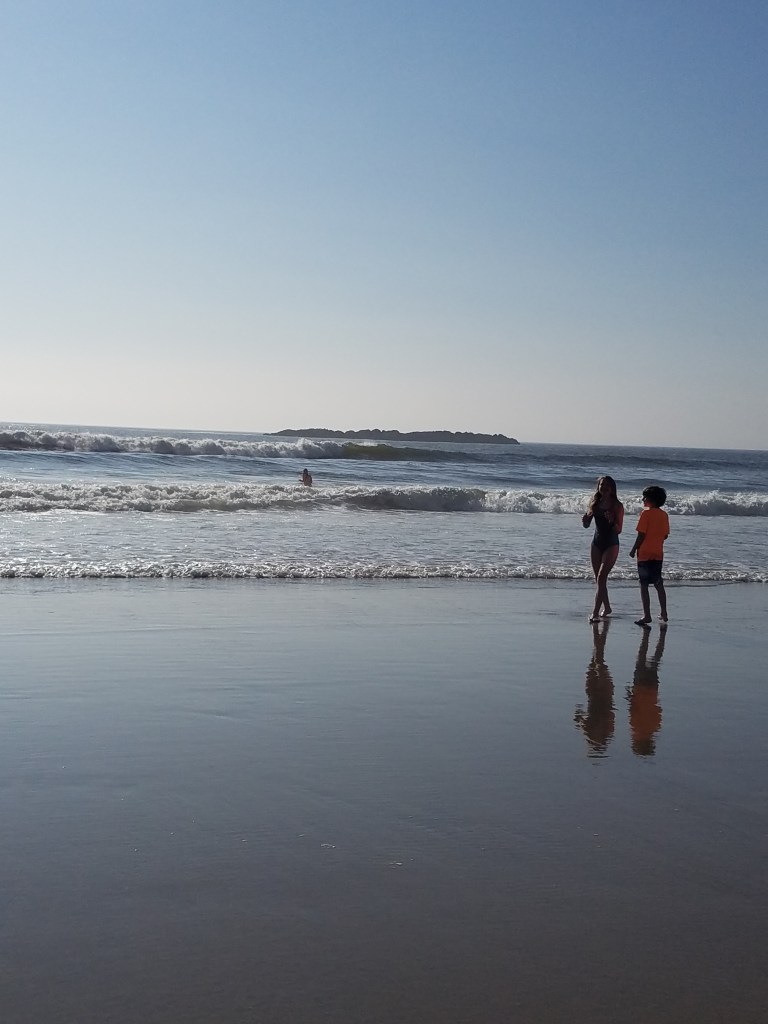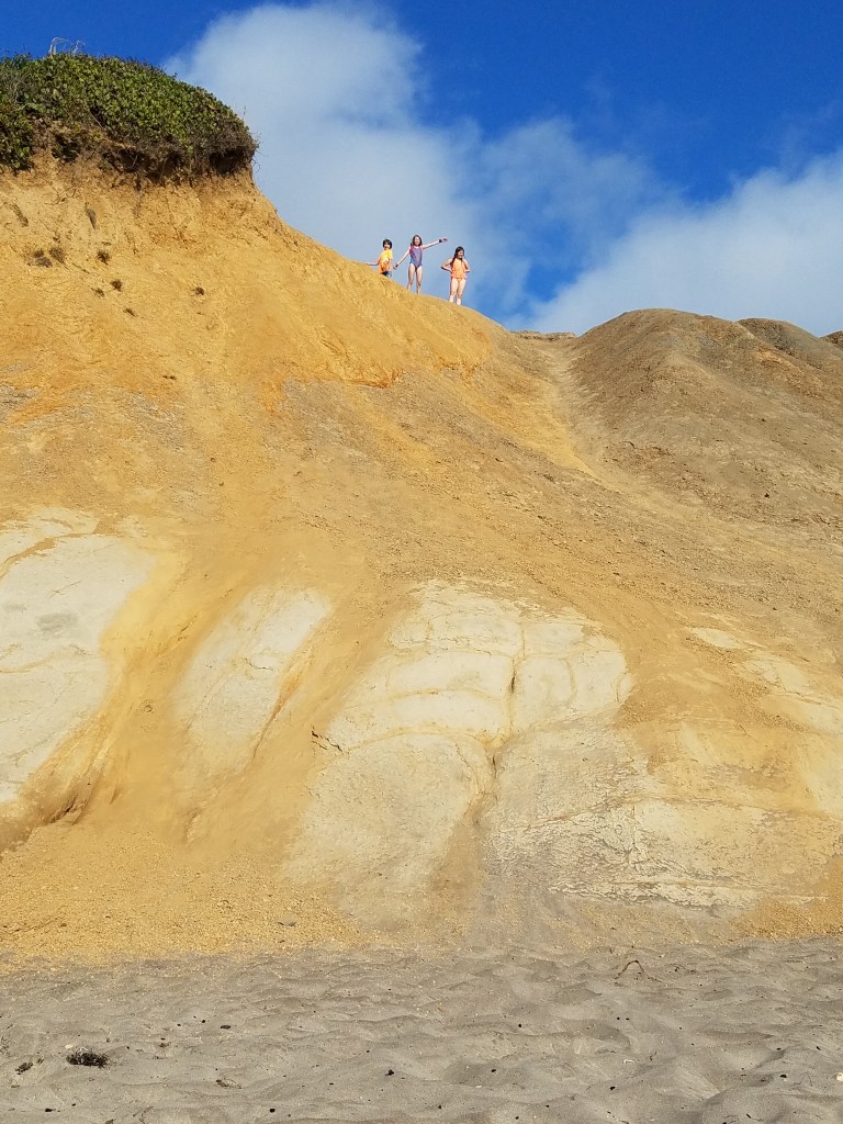 No magnet pulls a needle north more strongly than the ocean calls my children. Eventually, my cold, hungry, and happy children happily came back for hotdogs before returning to cliff climbing and hole digging. Dwayne kept building up the bonfire from half-burned driftwood, and we watched the sunset half-roasted ourselves. We saw teens go in surfing and come out cold to their family, so we invited them over to warm up at what was truly a vanity bonfire. Turns out, they are practically neighbors from back home, one town to the west of us. Fun coincidence.
