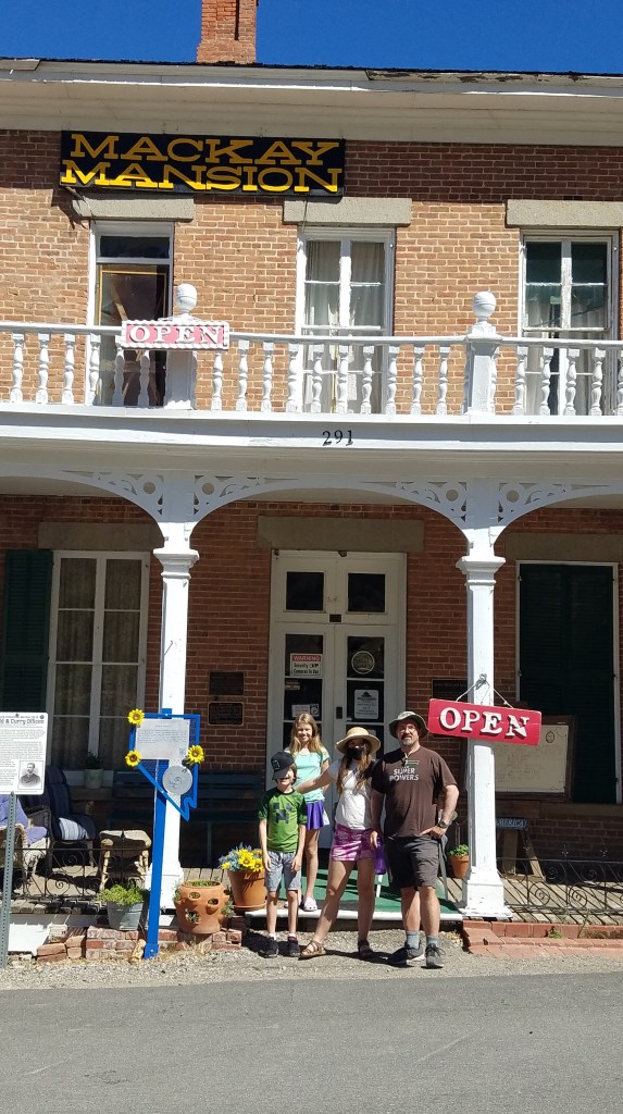 After ice-cream o’clock, we toured the McCay mansion. Of course, the best and most expensive houses of that time still fall short of the conveniences of today’s modern abodes (even RVs!), but oh! how I love the stories, the hand-painted fabric wall paper, the Italian imported hand-carved mantel, the too-narrow stairs up to the small master and mistress bedrooms. Always fun to look, but I’m not sure if anything could entice our family to live in this ugly climate. On to Lake Tahoe for the next few days!