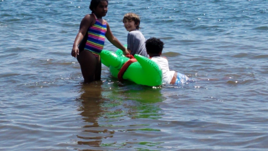 While we had some fun in the lake (and I hope Wes always remembers taking Dwayne and I down on the inflatable alligator), there was too much wind, a rocky beach, and sites so close together that the neighbor’s awning was inches away from our trailer, and we had to move his outdoor carpet while the kids used the outdoor shower to keep from soaking it. Oh, and in addition to the cost and lack of amenities, they charged 50 cents for a 2 minute shower token, and had no sewer sites.