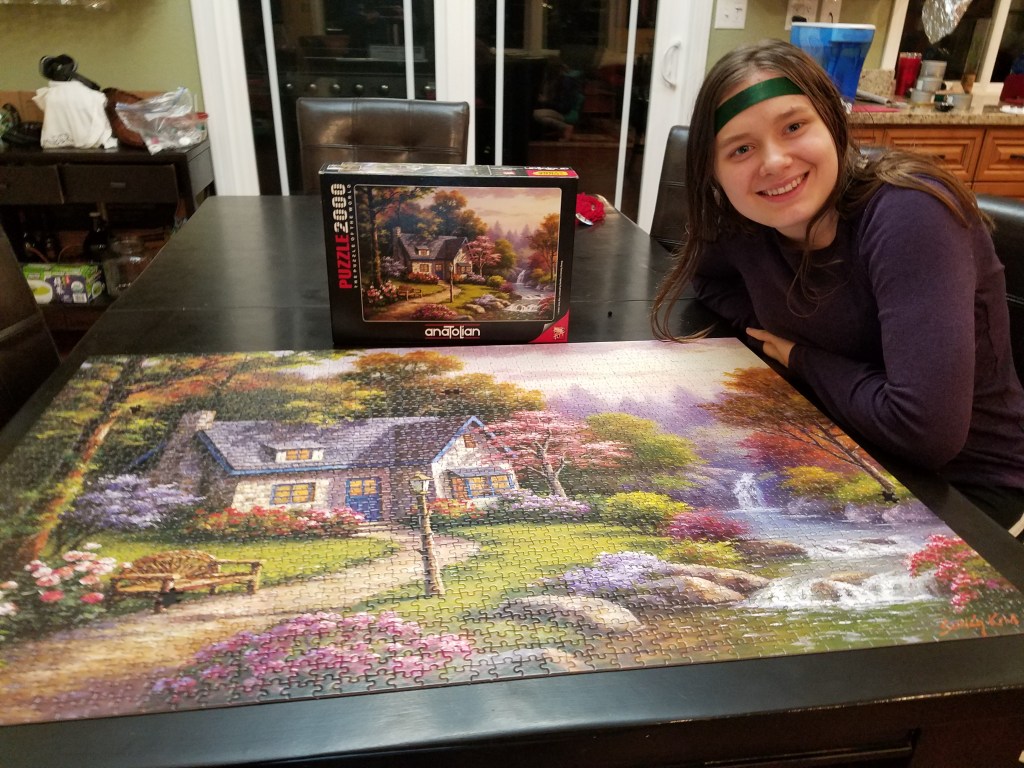 Kyla has spend this year upping her puzzle game, and when she was whizzing through 1,000 piece puzzles in a day, I bought her a 2,000 piece-er to slow her down. Turns out, it isn’t twice as complicated or as long. It’s far more. It took her months, with long breaks in between. On my honor, I will never bring in more than a 1,500 piece puzzle into our home again!