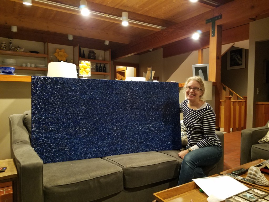 I, however, did not recognize the size and shape. In fact, it wasn’t until I got all the way down to the bubble wrap that it dawned on me that this was the piece of art I fell hard for at a Cannon Beach gallery in August. I flirted with ‘Mar Asul’ for a good part of that afternoon before giving it up for the lost cause it was. And then tonight, after much mystery and anticipation, I opened this, my own blue sea.