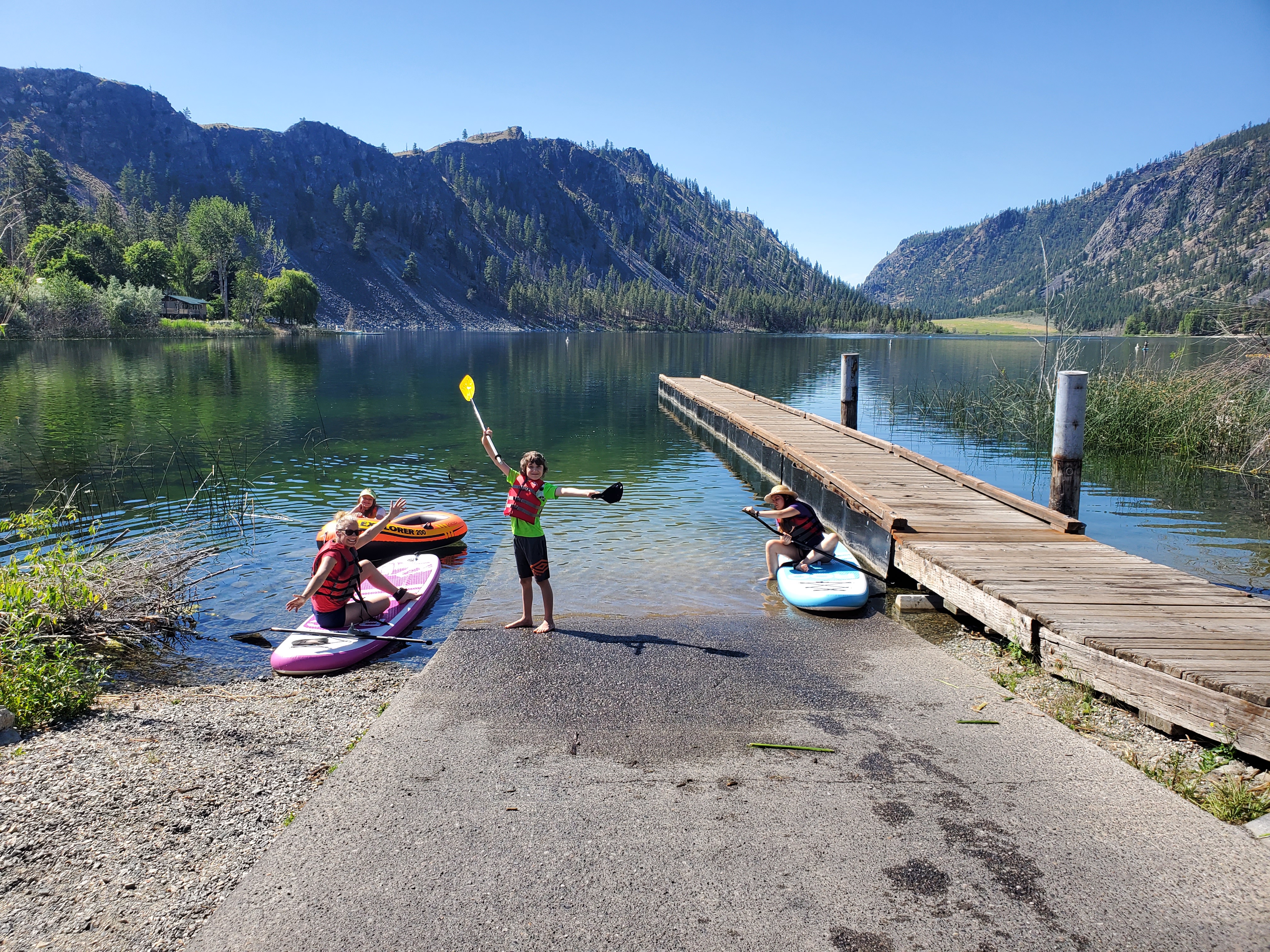 The first morning, I left my camera at camp when Dwayne and I went paddleboarding…and saw a bear come down for his morning drink, and so many sunning turtles, and fish, and birds-new-to-us. It was truly magical. The next morning, we dragged the kids along. And by drag, I mean I towed the little boat behind me all the way around the lake. Kyla was on her own SUP and carried her own weight, only dropping her paddle in a few times, necessitating me to drop the boat and quickly help her find it.