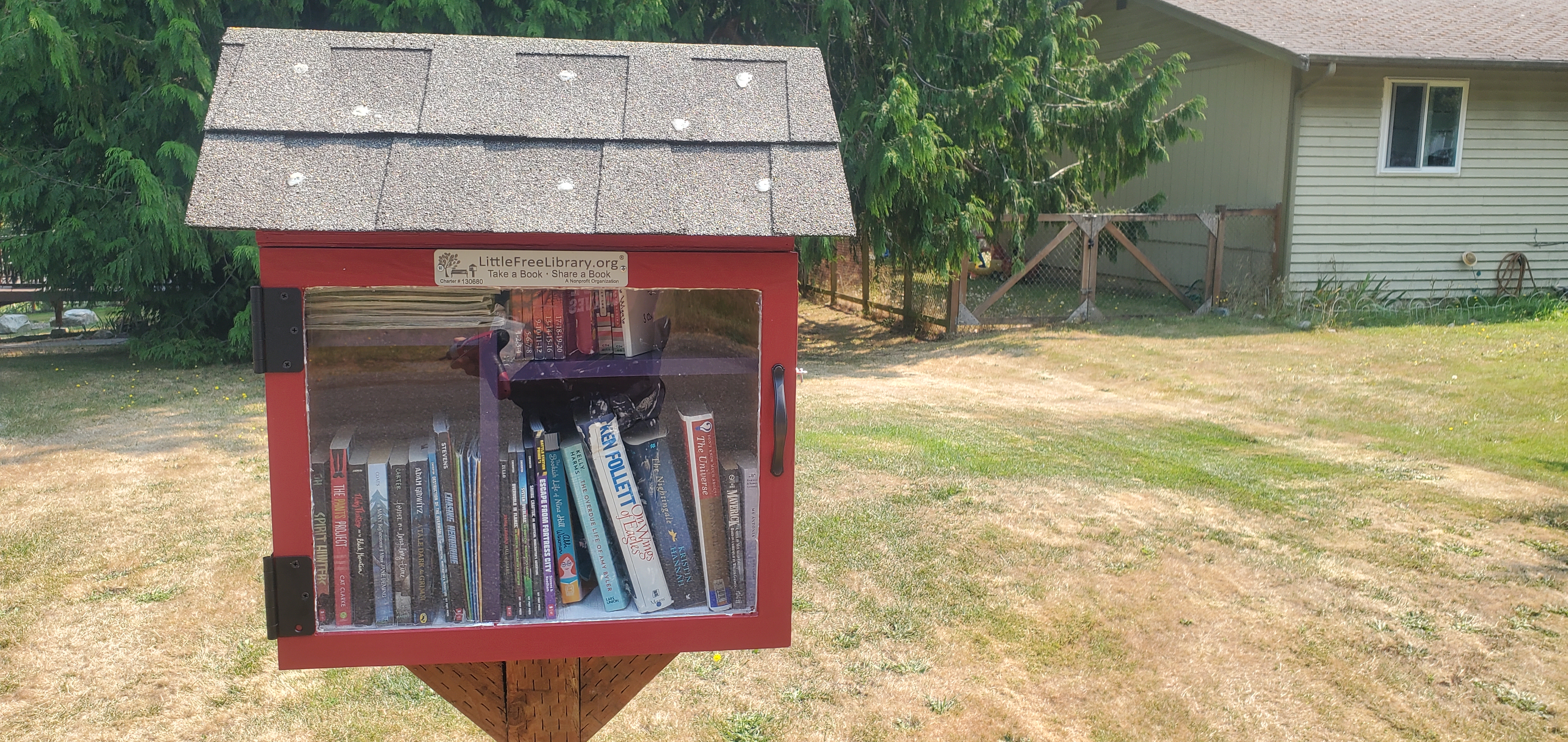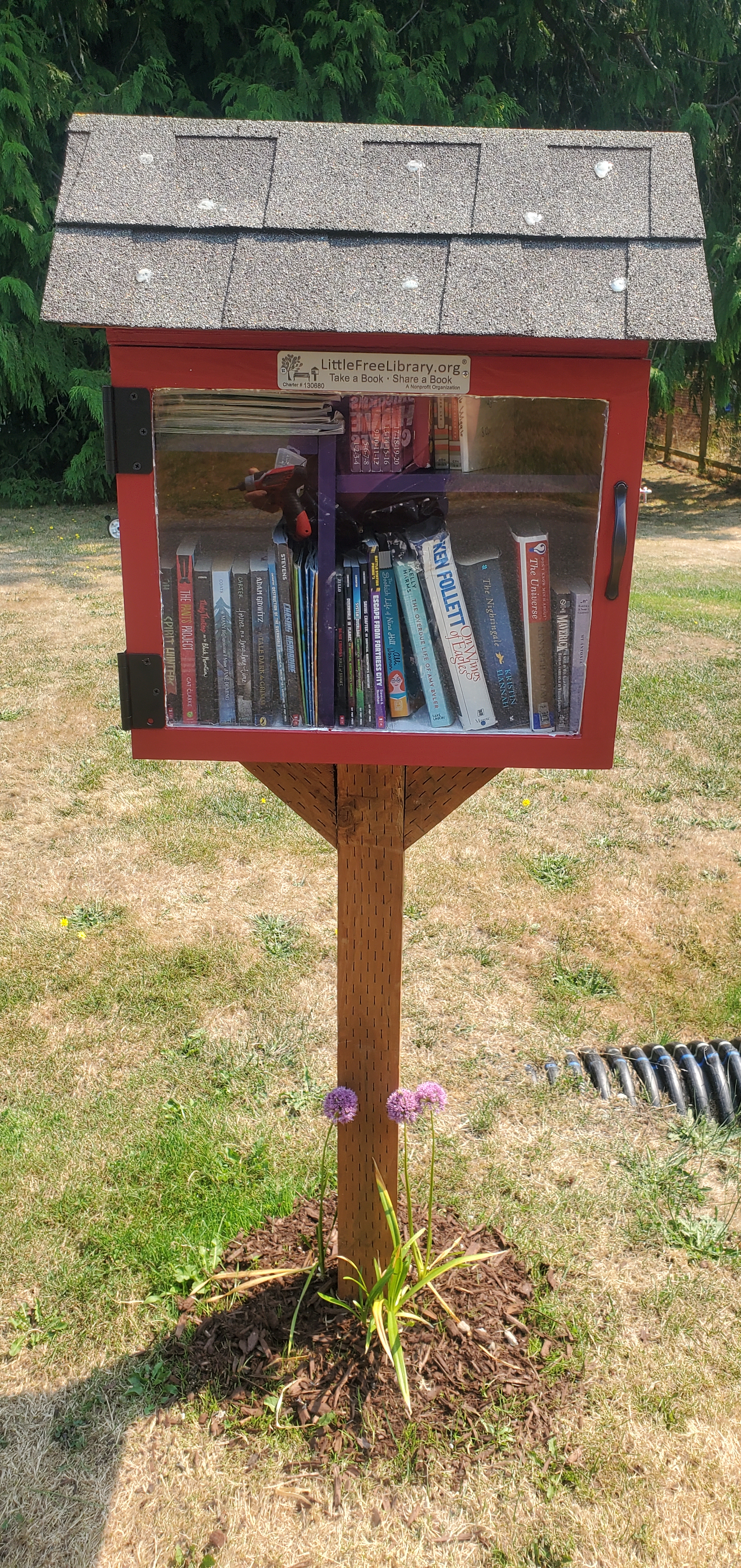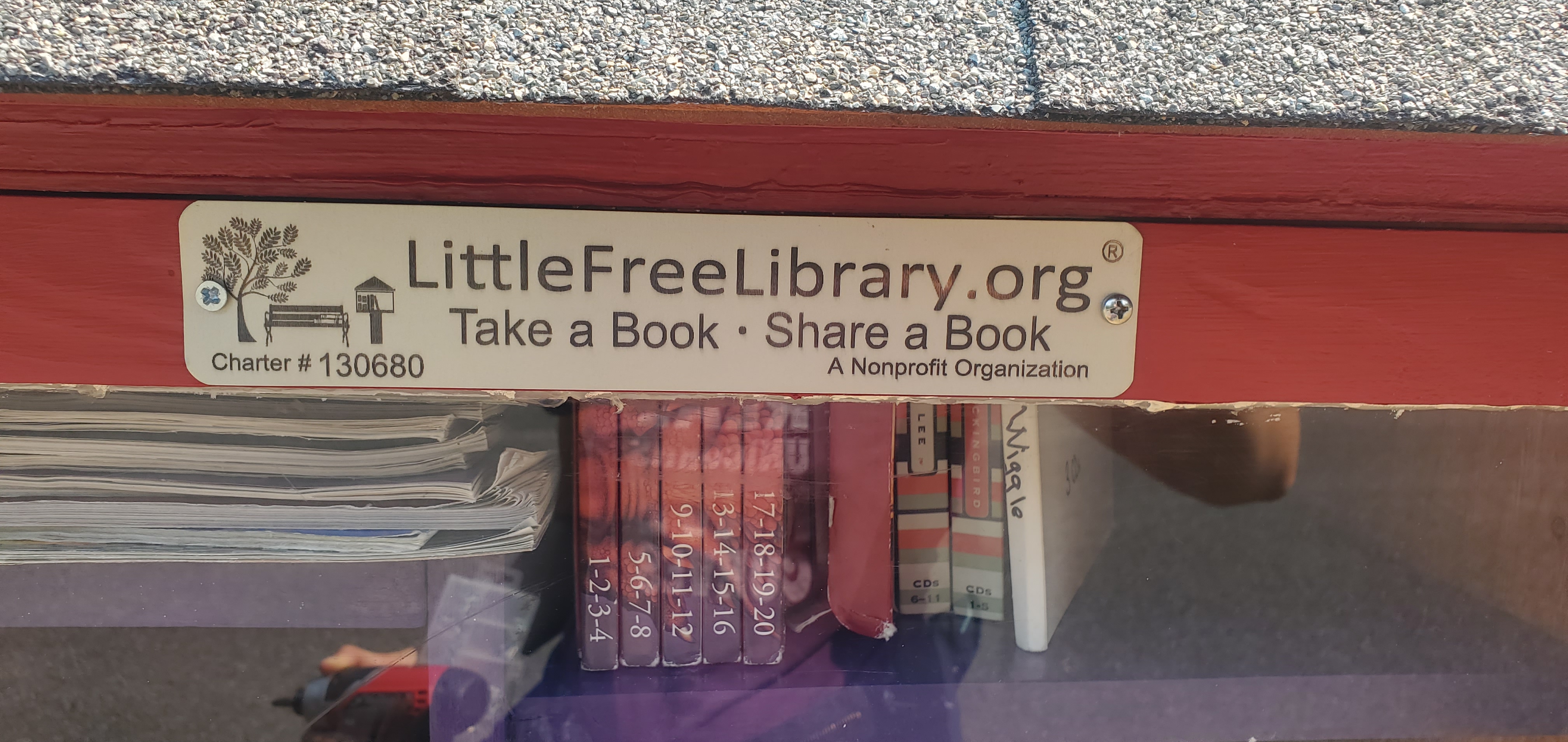My summer goal, besides reading my brains out, was for Wes and me to build and install a little free library (LFL) at the cabin. It turned out my dad did all the hard work, Dwayne was necessary to put the thing together, I did the design and decor, and Wes…did nothing. But I was very happy to install it and make it official– Charter #130680 can be found on the LFL map.