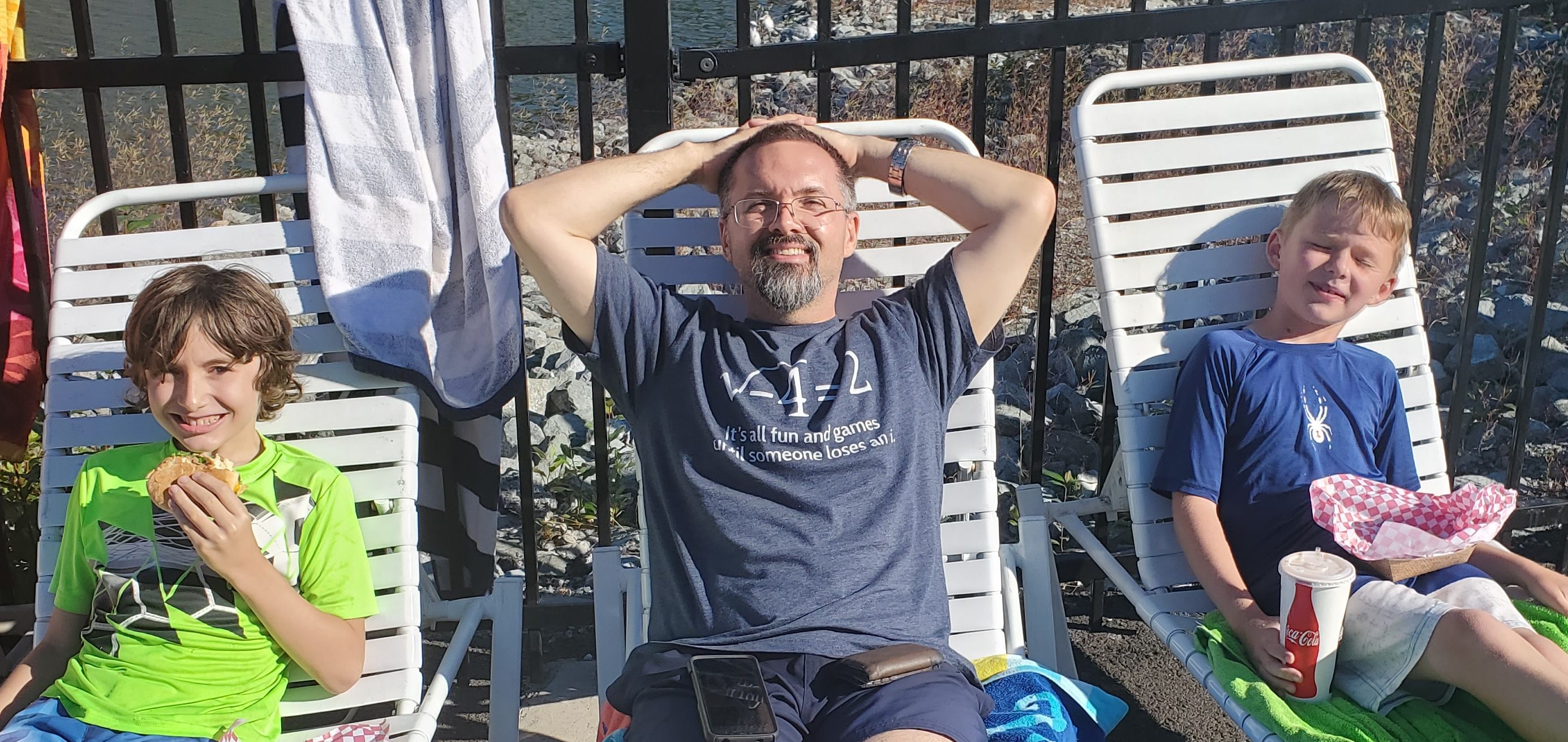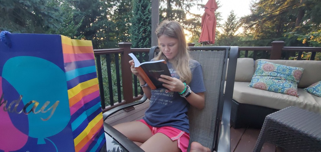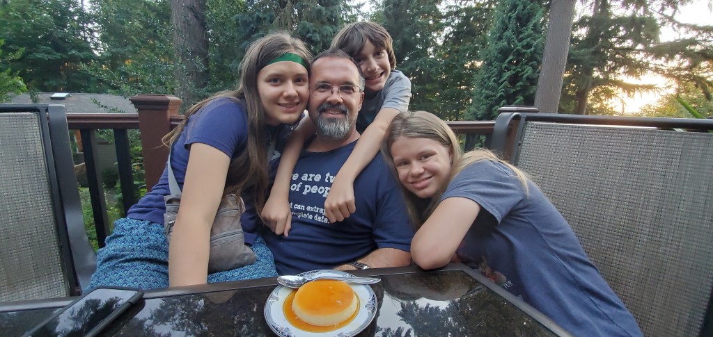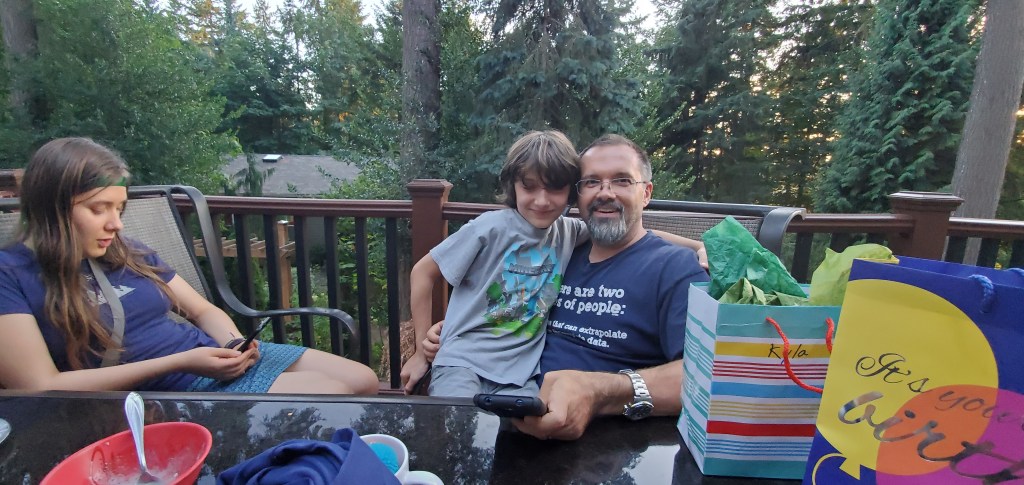 What Dwayne really likes for his birthday is a dinner out, with friends, his treat. We sort of alternate between the island and home, but we did something new this year. Friends who still have a too-little one would not be able to make it for a night out, so we hired a personal chef to cook for nine of us at the cabin. We brought Costco food for the kids, to be eaten at our friends’ house, while we splurged on a home-cooked-by-someone-else meal. Unfortunately, weather sent our picnic table inside, but it was still a perfect evening. Jon brought the bucket of homegrown veggies that Chef Raina turned into part of our scrumptious dinner.