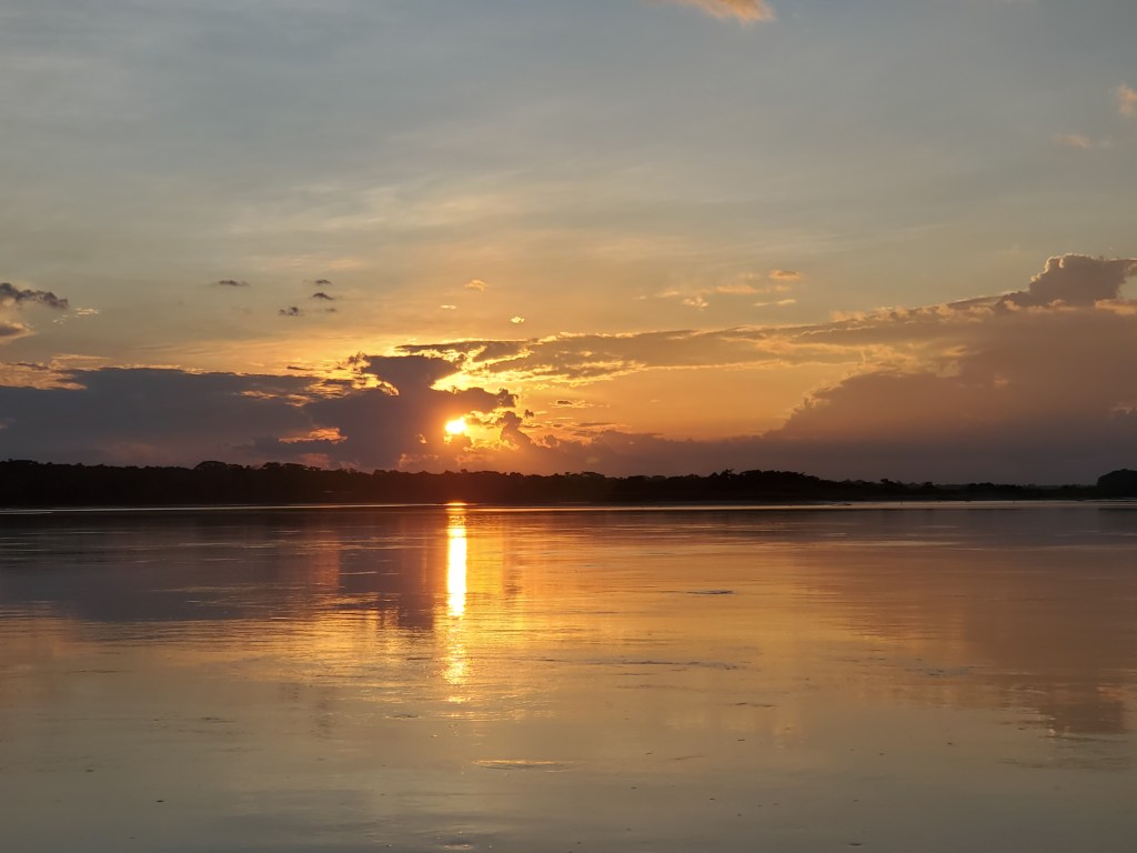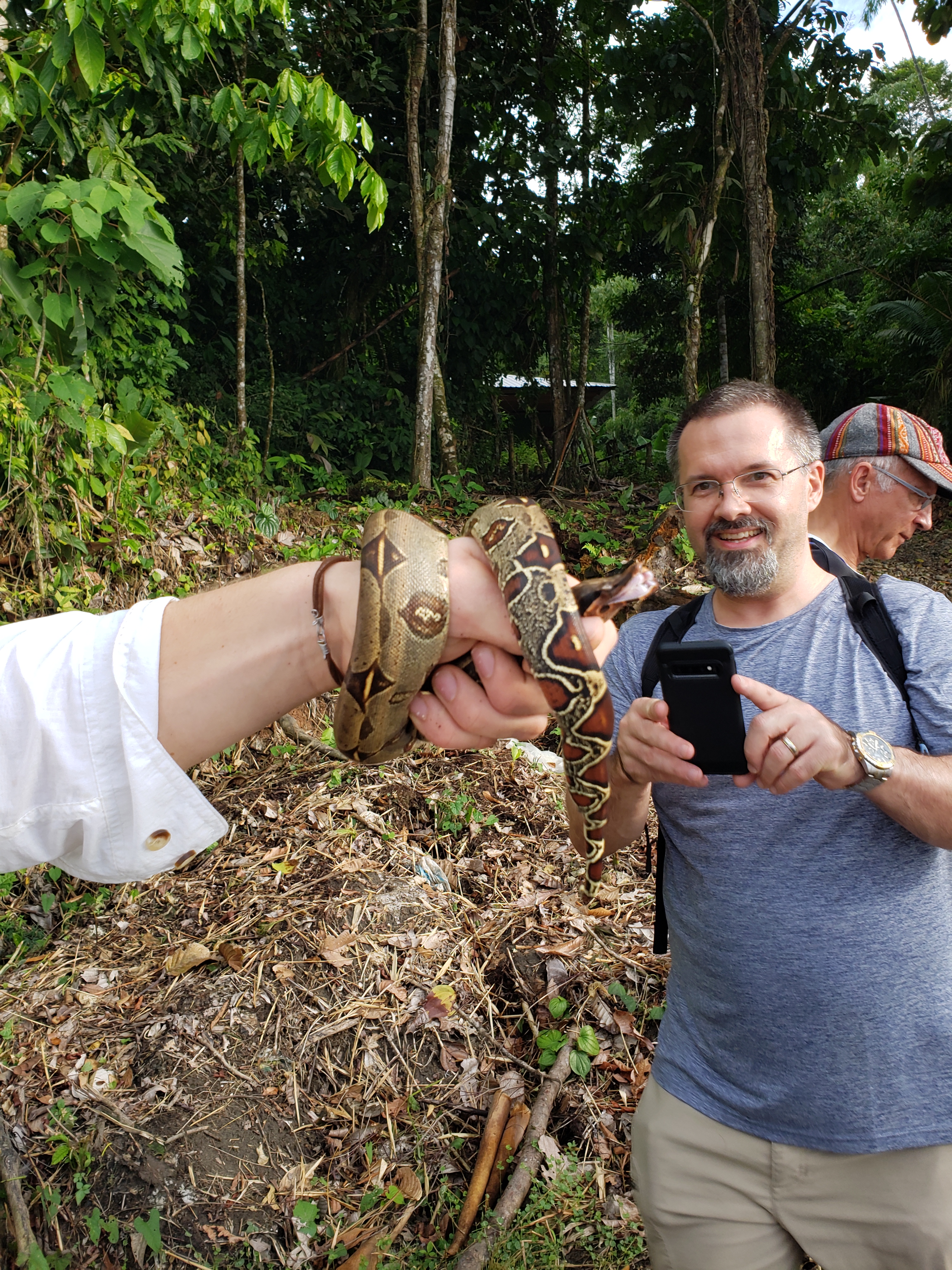 One of my highlights was our last afternoon, despite of a boa constrictor’s appearance. The kids all elected to stay behind, and the adults hiked through the forest and up a hill a bit to get to a climbing tower that rivaled the height of the tree it was built next to. Two hundred twelve steps up, and the guides uncorked the champagne as we got to survey the expansive jungle below. Almost no birds or animals celebrated with us; however, we did get to enjoy this sunset and excellent company.