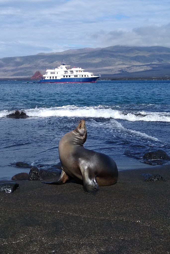 The beaches were the best–organic white and volcanic black both delighted us. The seal lions accompanied us everywhere, and we enjoyed the trails the marine iguanas made in the sand and the colorful crabs. Can you spot all three species … not including the homo sapiens?