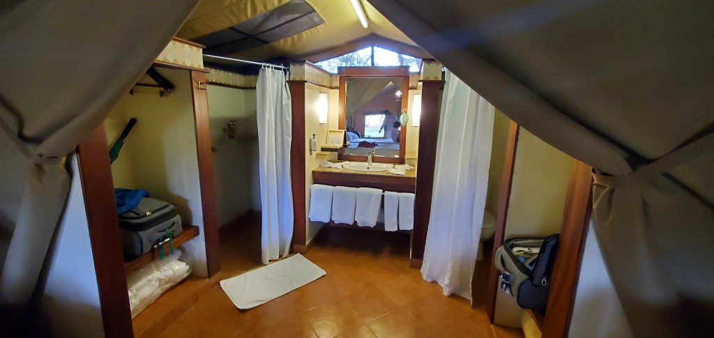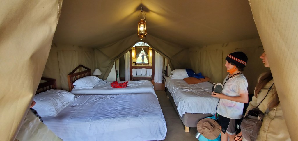 The camp itself was exciting for two reasons: 1) we were finally staying in tents (“tents”, as in attached full bath and all the conveniences, much nicer than even Hermione carried around in her little purse), and 2) the tents were wrapped around the perimeter of a very popular watering hole.