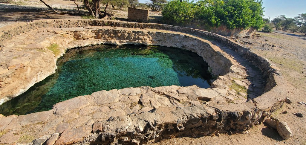 ‘It’s a bomb site,’ says our guide. We gape. ‘From World War II,’ he continues. ‘It was 1940 and a squadron of Italian fighter planes were flying back to Ethiopia. They looked down and saw a huge herd of buffalo drinking from this spring. They mistook the buffalo for the tents of the British, who were advancing towards the Ethiopian border, so they dropped a bomb on them’. He regards the huge rocky basin with placid unconcern, ‘and this is what’s left,’ he finishes.