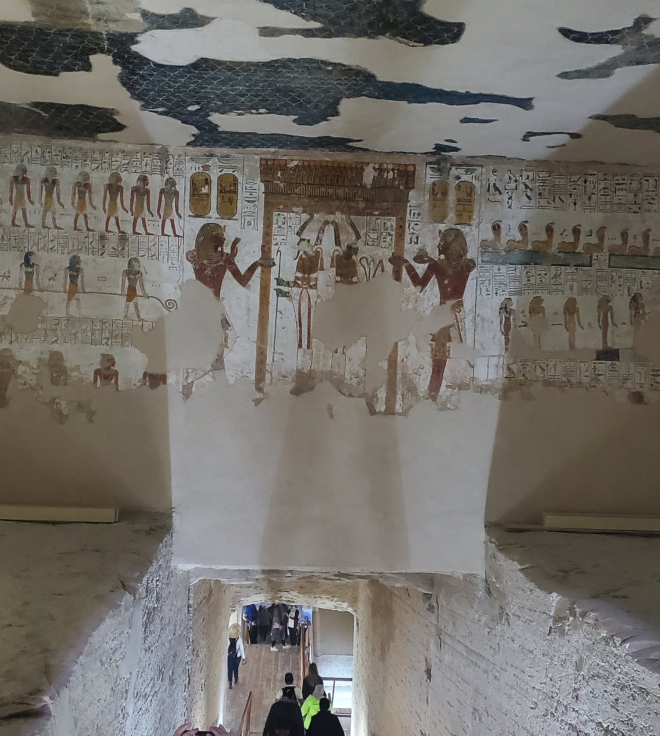 The City of the Workers is interesting as it is the only site where “regular people” residences have been found. The top workers got to build their own burial chambers—these were so much smaller than the kings, of course, but fascinating as the three we got to duck into were colorfully painted. They were made of straw mudbrick and were not engraved, but the scenes of paradise, a guarantee for all non-pharaoh people, are a bright and unique antiquity.