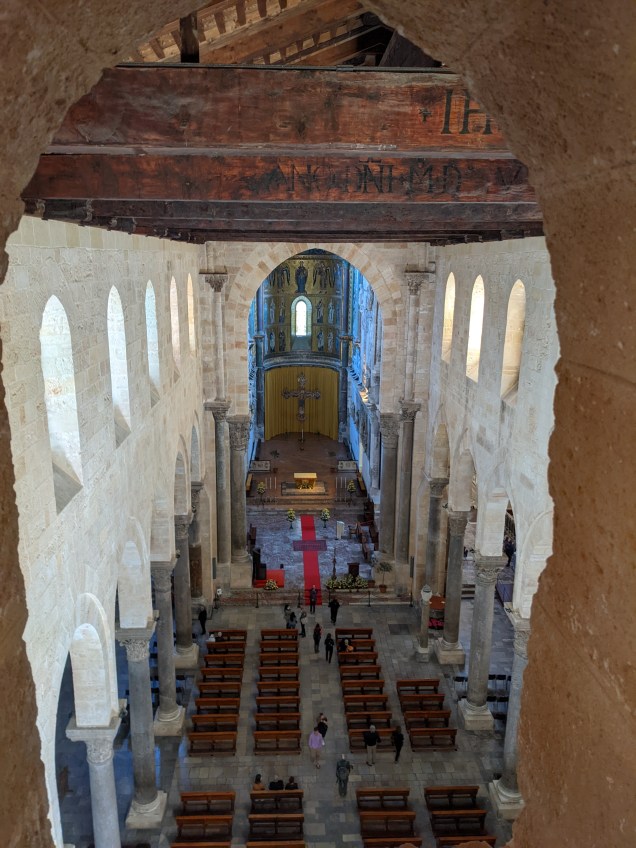 I haven’t yet tired of places with old towns, with alleys barely wide enough for a chariot and shop after shop selling either gelato or made-in-China tchotchkes. Cefalù (Chĕff’ uh loo) is a low-key beach town that combines Olde Towne charm, decent beaches, good pizza, a castle-on-top-of-the-hill, and non-lethal Italian driving. And, of course, there’s the requisite duomo (cathedral). We waited until the kids were with us before we bought the full exploration tickets, not at their request.