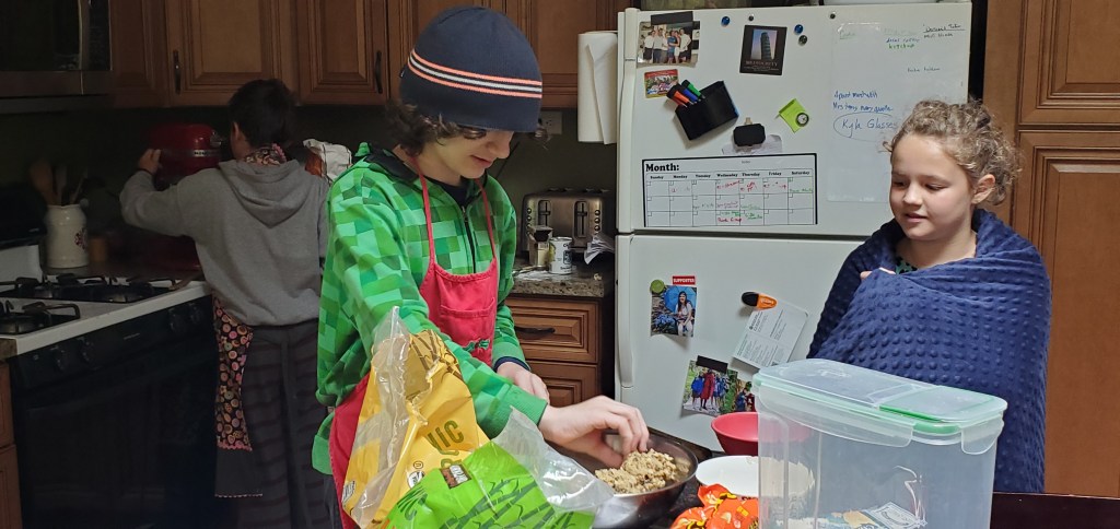 I love these kids, and it’s fun to have a housefull of tweens and teens. In the morning, C challenged the boys to a cookie-making contest. Neither boy had really baked before, so merriment and mess was had, and everyone was a chocolate chip winner. At least, that’s how I choose to recall it.