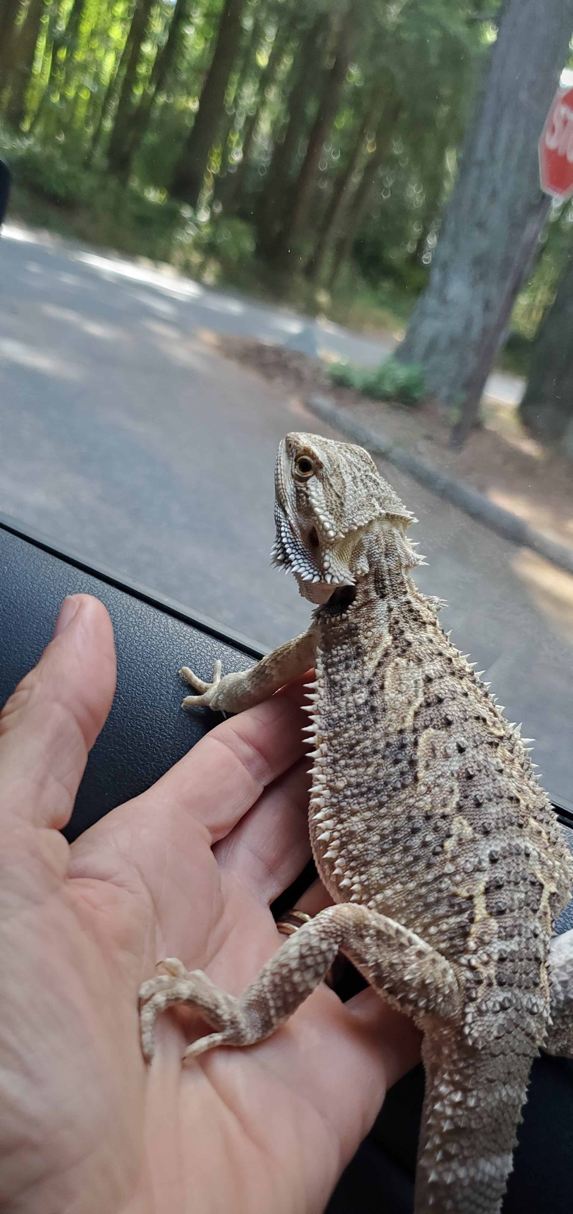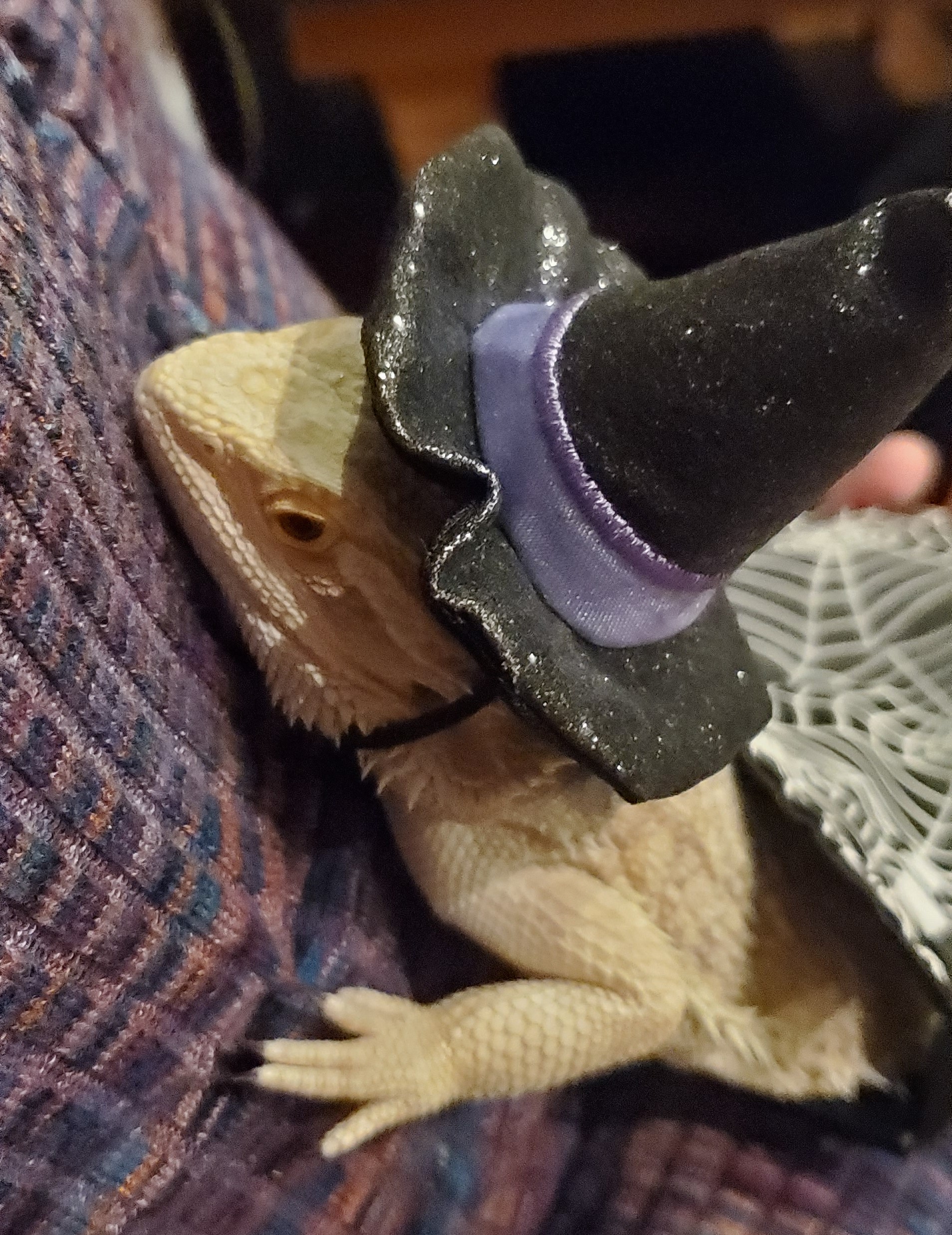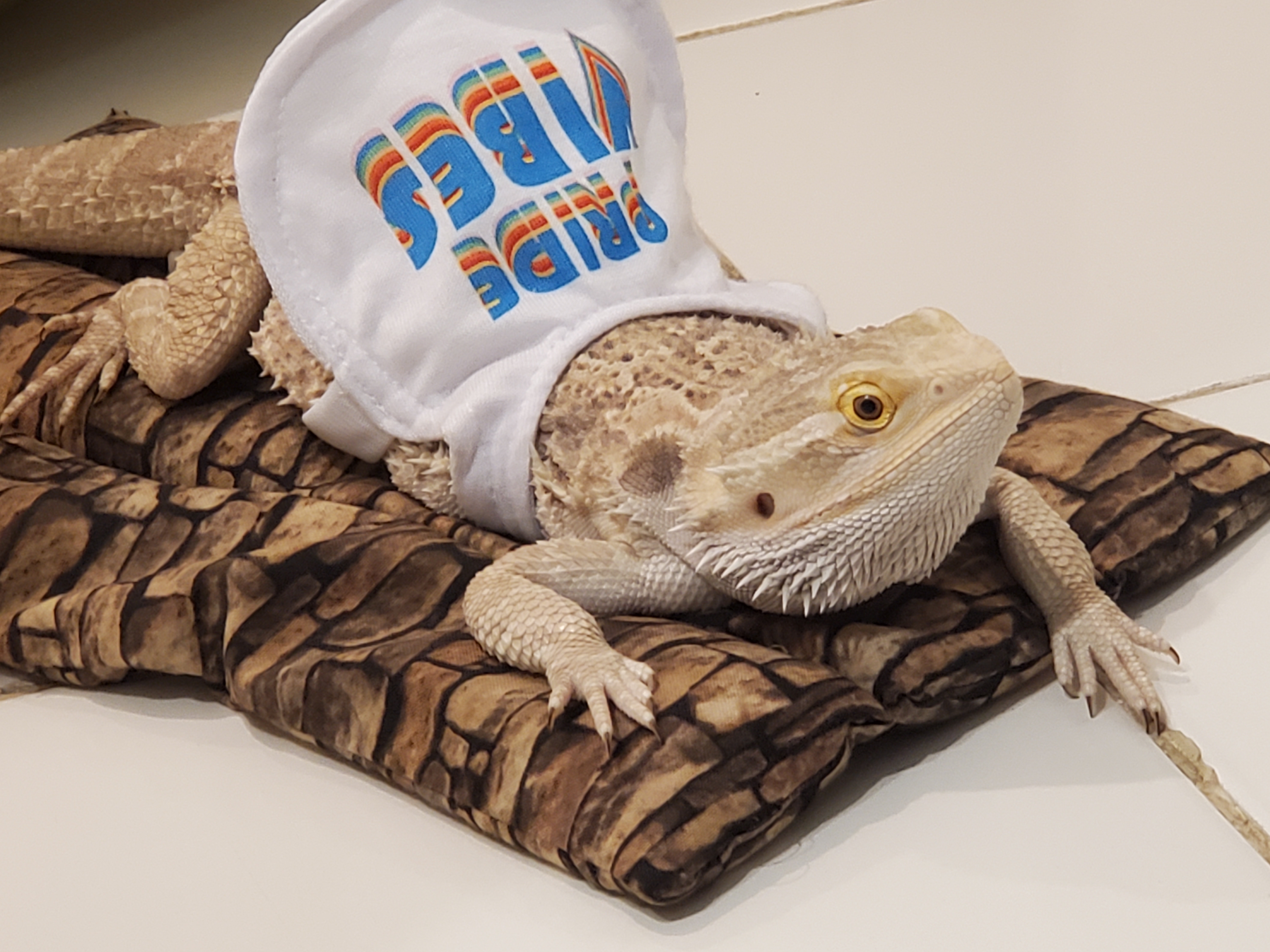Piper brought changes to the household this year when she, through clever manipulation, slide presentations, and likely out-and-out lies, convinced us to let her get a bearded dragon. And, full confession, I ♥ him! Nugget (Nugs, Nuggie) is like the grandson I’ve never had. I buy him cute outfits, I snuggle with him, I bring him treats of arugula and crickets, and he rides around on my shoulder. He’s been an emotional-support pet for Piper as he accompanies her to parades, Farmer’s Markets and holiday bazaars, and now that he has his own 10 gallon “RV” (instead of his 40 gallon home tank), he is able to do weekend trips with us as well. (Plagiarized from my 2023 Christmas letter.)