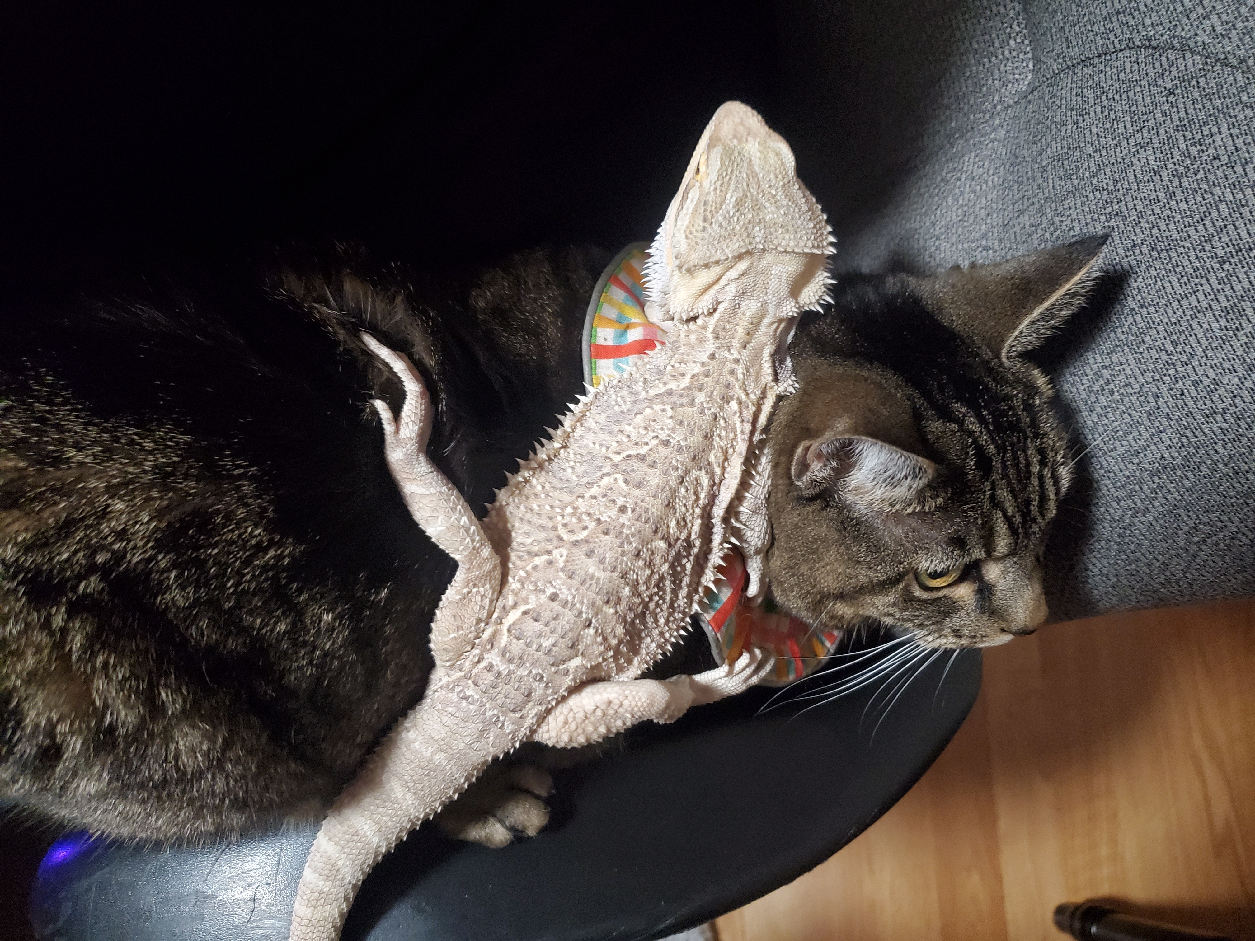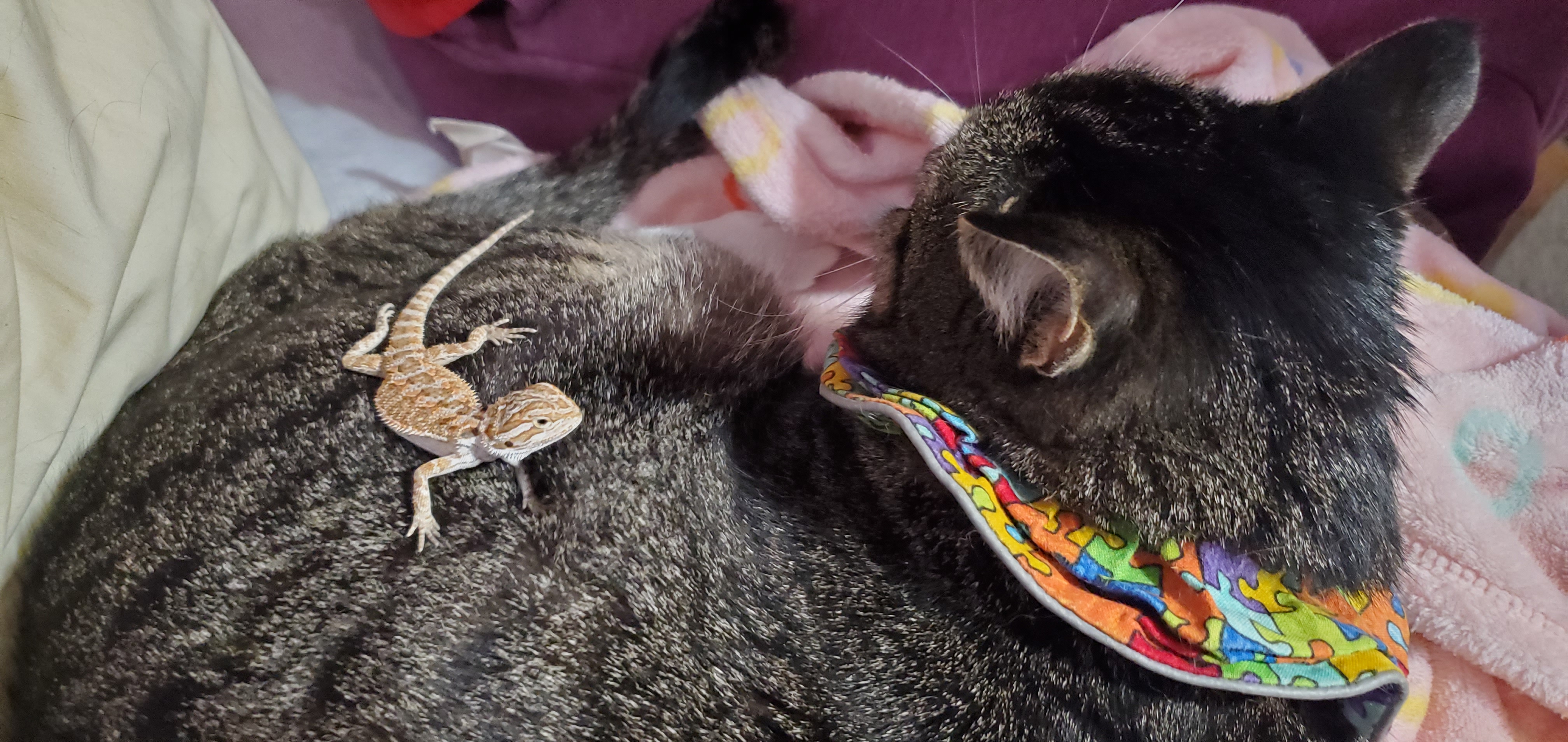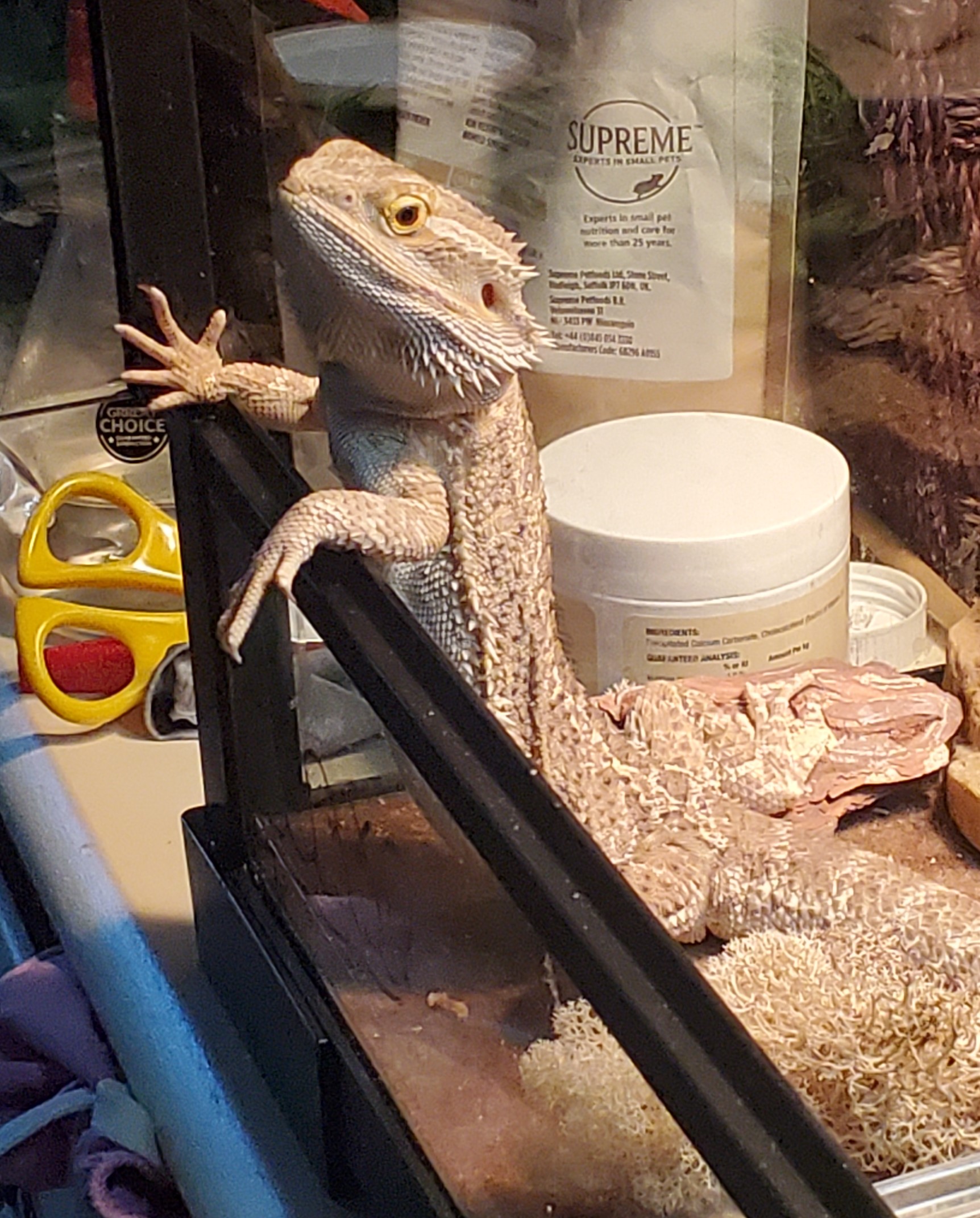 Piper brought changes to the household this year when she, through clever manipulation, slide presentations, and likely out-and-out lies, convinced us to let her get a bearded dragon. And, full confession, I ♥ him! Nugget (Nugs, Nuggie) is like the grandson I’ve never had. I buy him cute outfits, I snuggle with him, I bring him treats of arugula and crickets, and he rides around on my shoulder. He’s been an emotional-support pet for Piper as he accompanies her to parades, Farmer’s Markets and holiday bazaars, and now that he has his own 10 gallon “RV” (instead of his 40 gallon home tank), he is able to do weekend trips with us as well. (Plagiarized from my 2023 Christmas letter.)