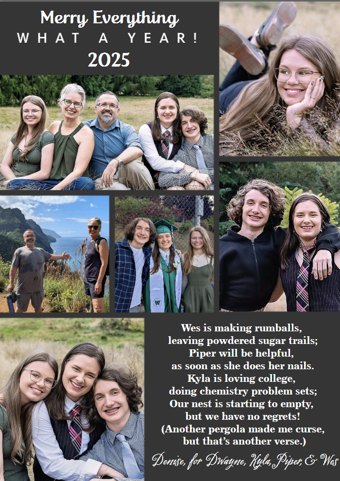 Denise, for Dwayne, Kyla (19), Piper (17.8), & Wes (15.9)