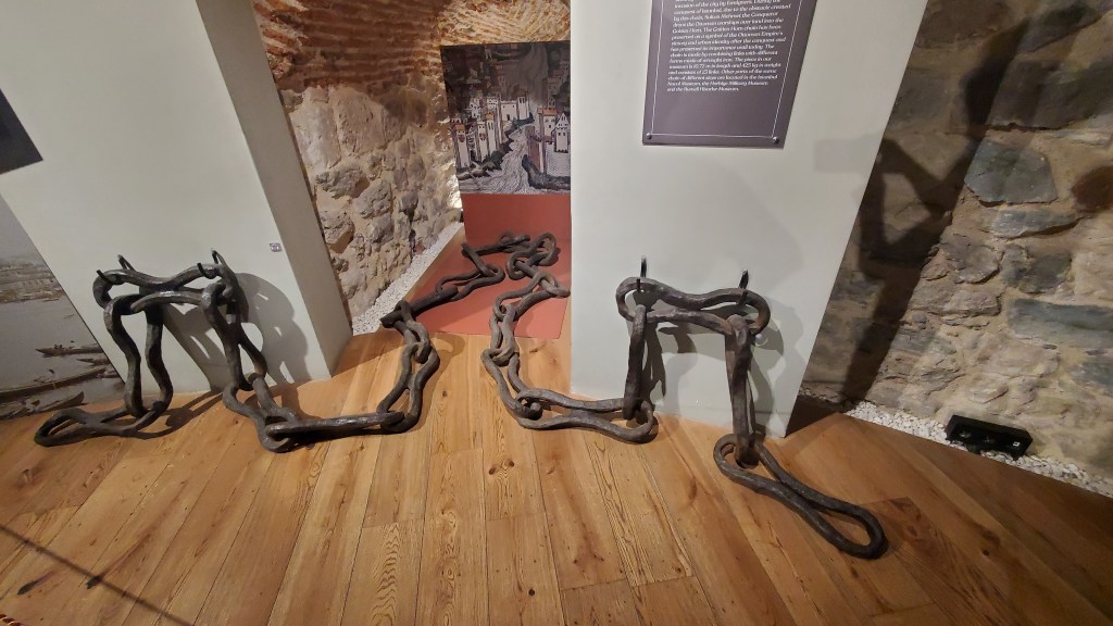 The Golden Horn is the waterway that was the strength and weakness of mighty Constantinople. Strong, because it made the city a perfect location for trade. Weak, because where trading ships can enter, so can enemies. An enormous chain was forged, stretching from tower to tower across the water, in the 9th century. Eventually, complicated pulleys and magic allowed it to be raised and lowered, a bit like a drawbridge. It worked well to keep enemy ships out. It even worked well when enemy ships “pottaged” — landed, rolled foot by food over logs around the chain and then set back in the water. The Byzantines just set some of their old ships on fire and sent them out to engulf the invaders, who couldn’t escape because the damn chain was in their way. But the Ottomans, in 1453, somehow pottaged successfully and used gun power to get through the previously impregnable land walls. That last breech is considered the dying breath of the Middle Ages–and the end of the Roman Empire.