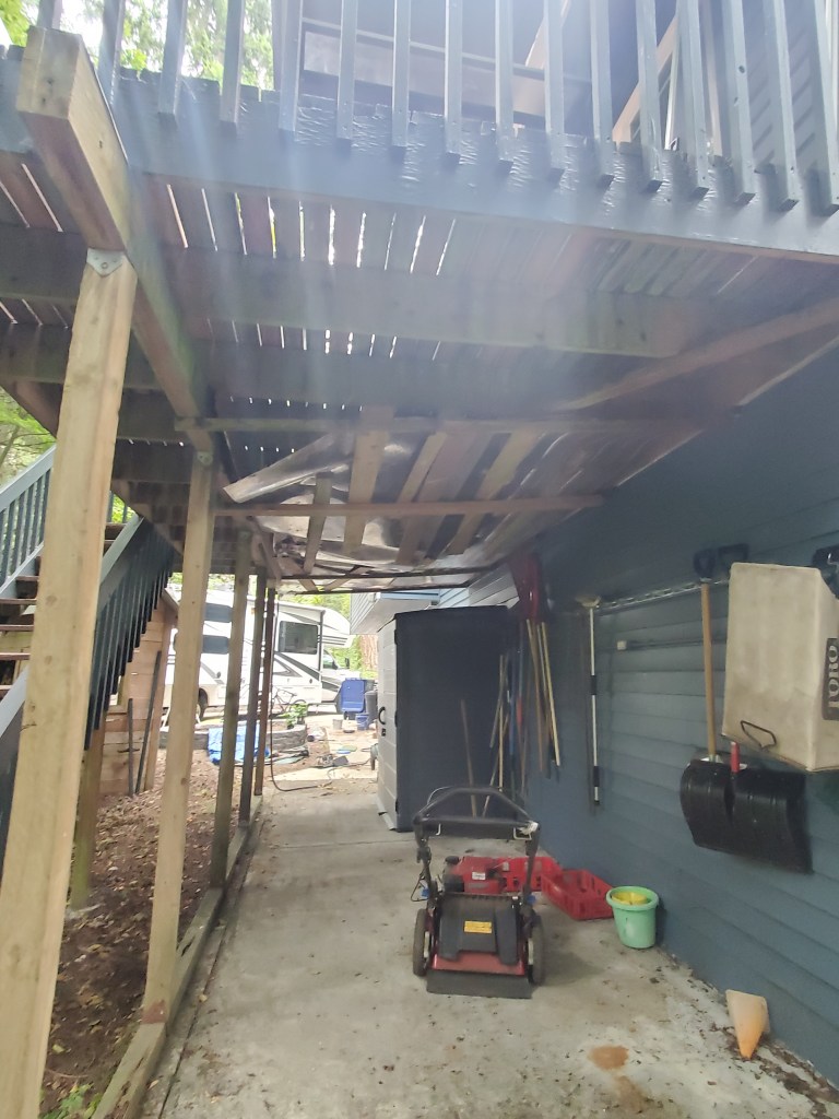 My other project that has been on my list for 19 of the 20 years we’ve lived here is to improve the under-the-deck cover. The deck is still sturdy but the yucky rigid plastic sheets held up by rusty screws and leftover wood siding worked as well as a holey umbrella to keep our garden equipment sheltered and dry.