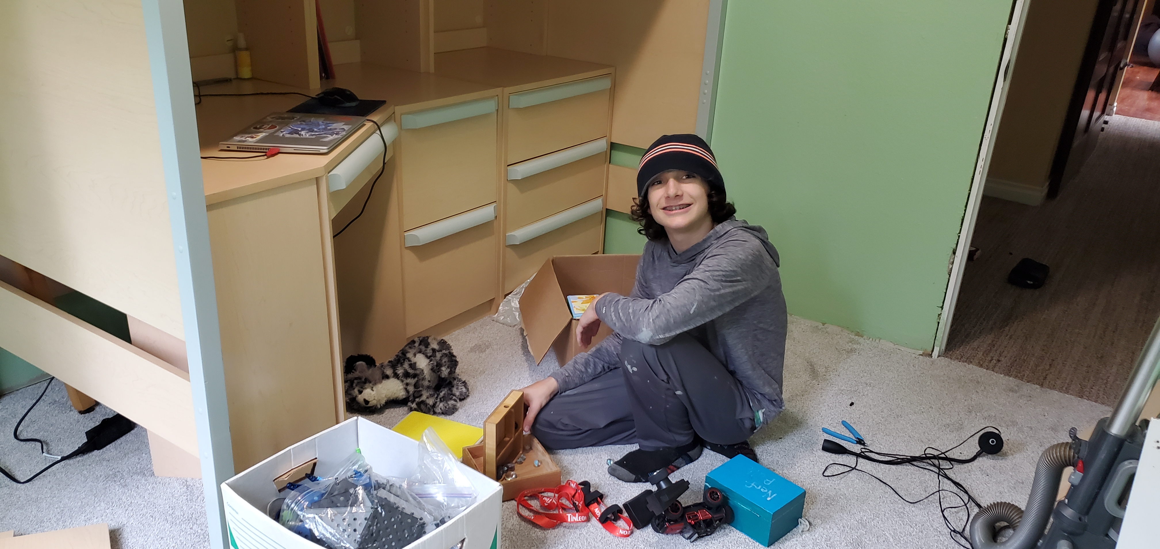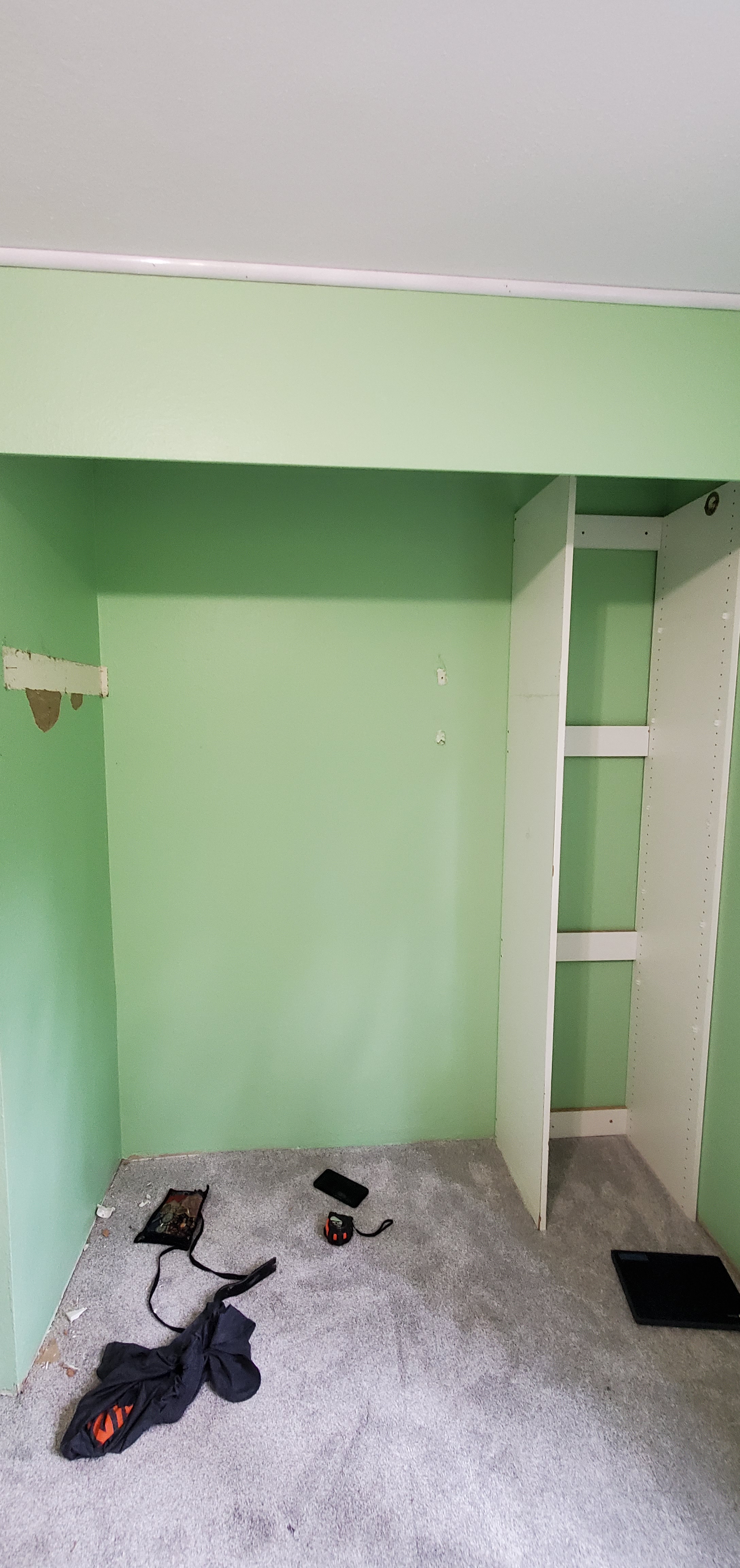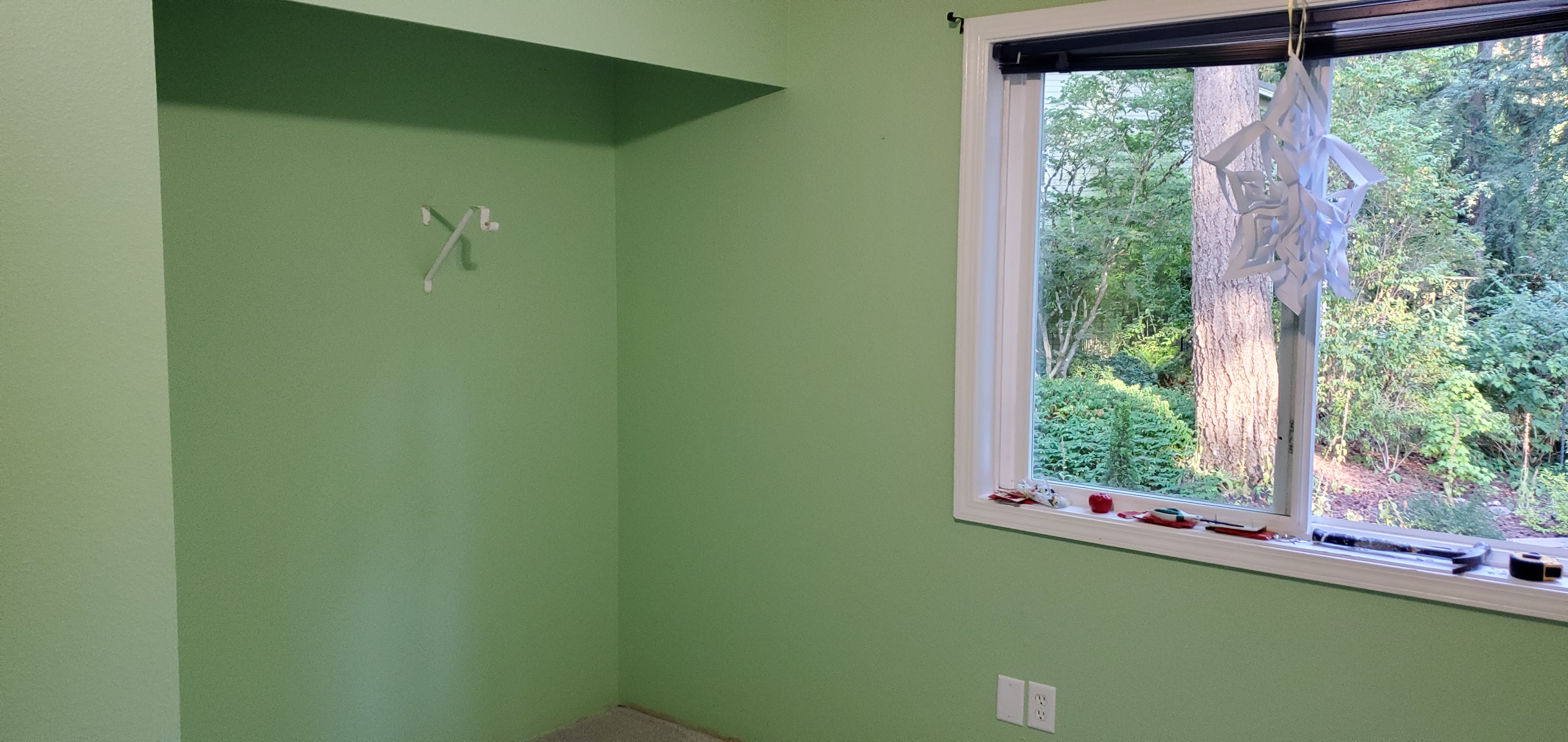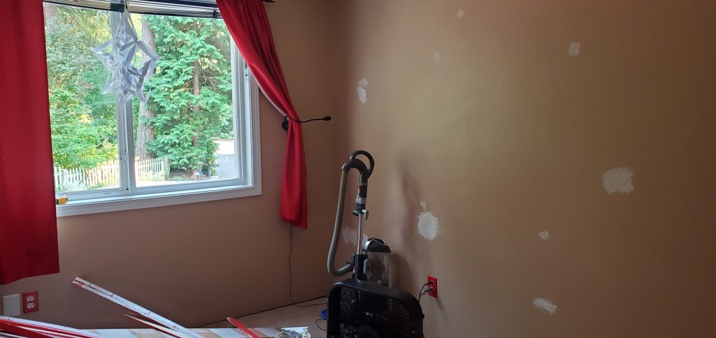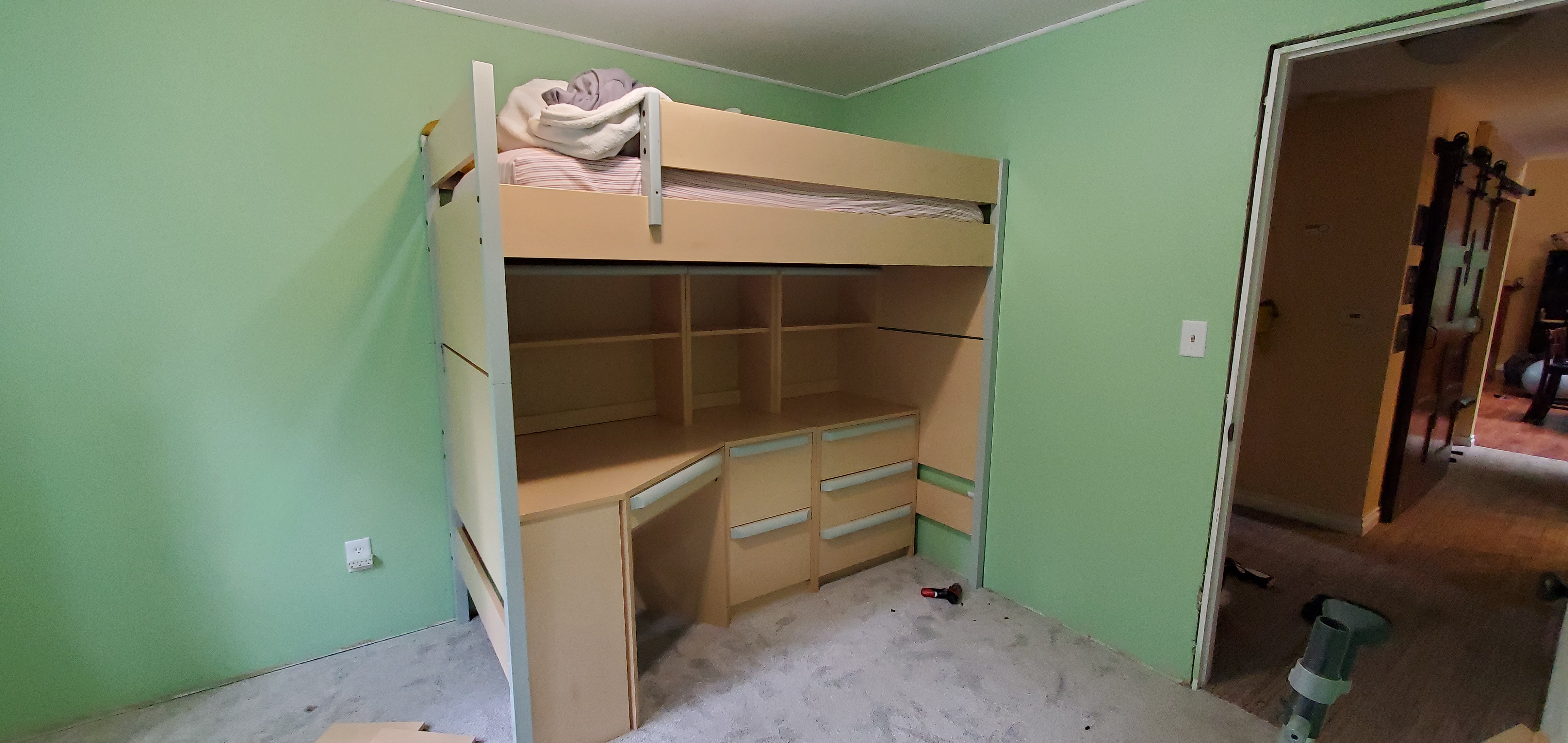 Wes’s room was just a disaster. He has the smallest room and it’s transformed from Kyla’s nursery to Wes’s tween room really by just swapping used furniture for other, bigger used furniture bit by bit, and then stuffing it full of “treasures”. I thought about offering Wes a loft bed to give him another room redo and him more floor space. Still going with the used theme, we found an entire set on Craigslist that he loved. As we cleared out his room, we realized that his carpet was even worse than I thought. It hadn’t survived the potty training phase, the slime phase, the stolen scissors phase, or any other of my kids’ life phases very well. And if one is going to replace the carpet, one should just paint the walls (and the ceiling). The upshot is Wes got the exact room he wanted AND *everything* had to be touched, removed, and sorted. He did some serious decluttering and I did the repairing, cleaning, and painting, and together, we sighed with relief when it was done.