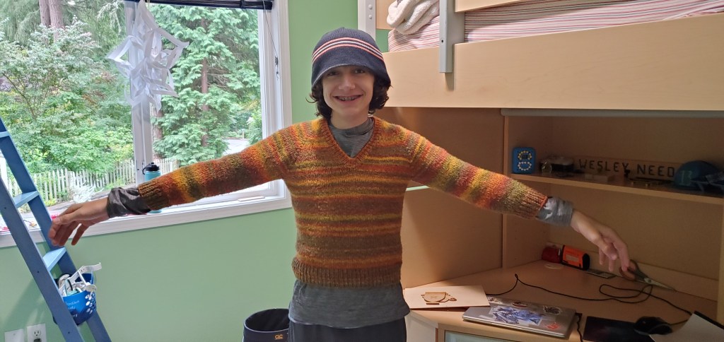 Just for fun, this boy is on a growth spurt. Here’s a sweater Grandma made for him several years ago–he’s officially outgrown it!