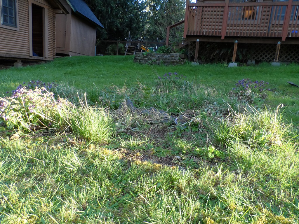 I also worked on the front yard. There’s a circle of “flowers” (okay, mostly weeds and overgrown grass) in the middle of the lawn. It will look better and be easier to maintain when I can dump some dirt and grass seed over it. But it will be slow progress, done only when it’s warm, dry, and we’re not at the beach.
