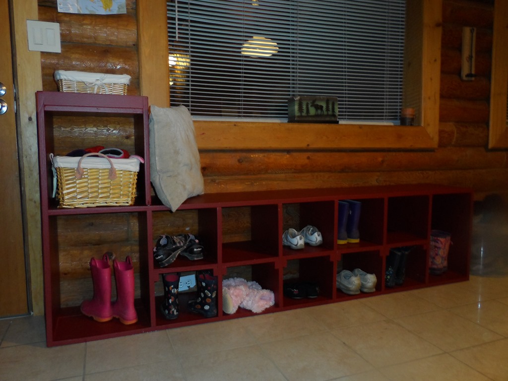 And after coats and coats of paint (cheap paint over expensive primer is still….cheap paint on plywood), it actually turned out just as I had dreamed. And, yes, I daydream about such things as boot benches. It is sturdy and rustic and practical and useful and cost me all of a gallon of cheap red paint and the use of my garage for a month to park the minivan.