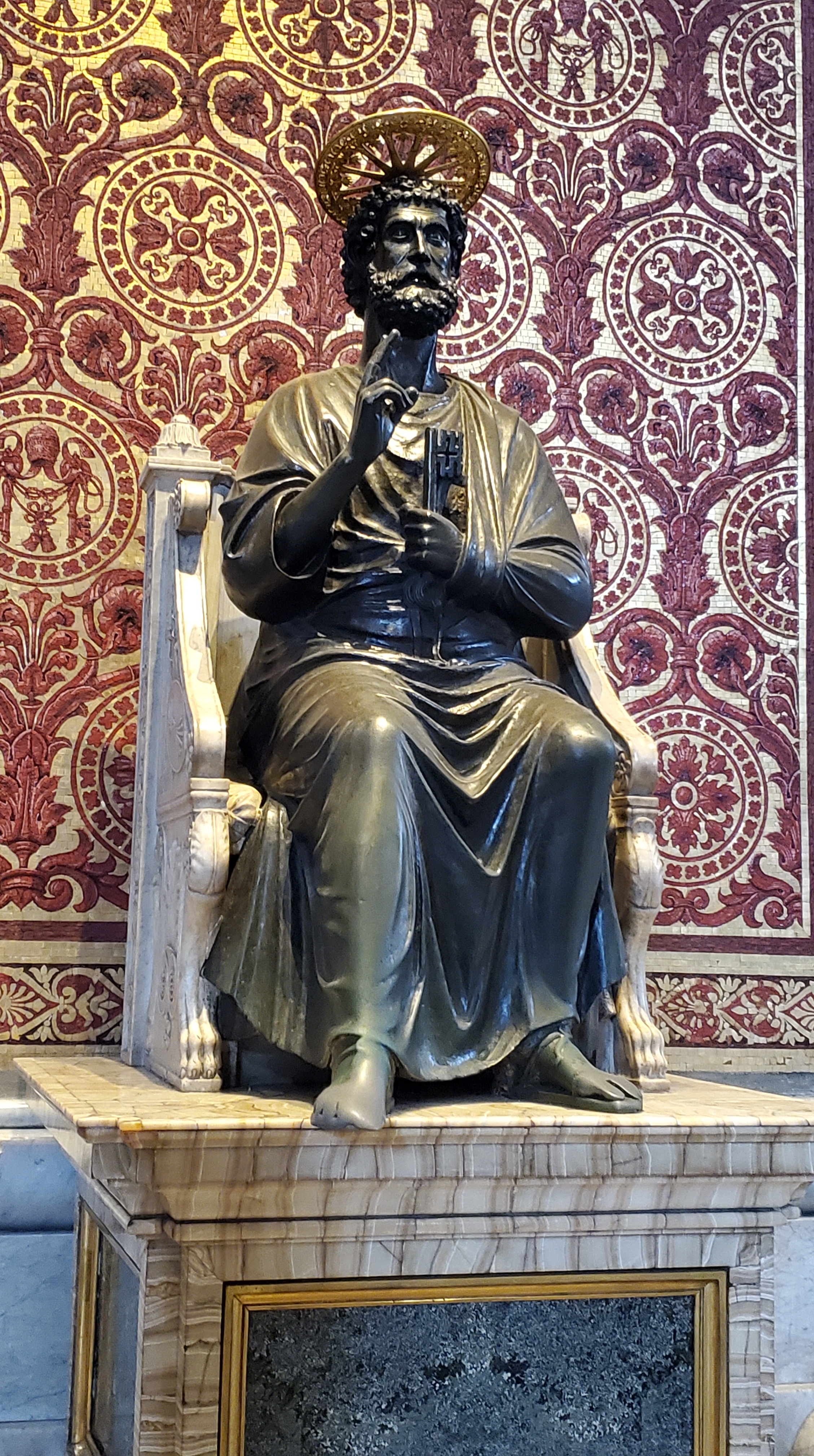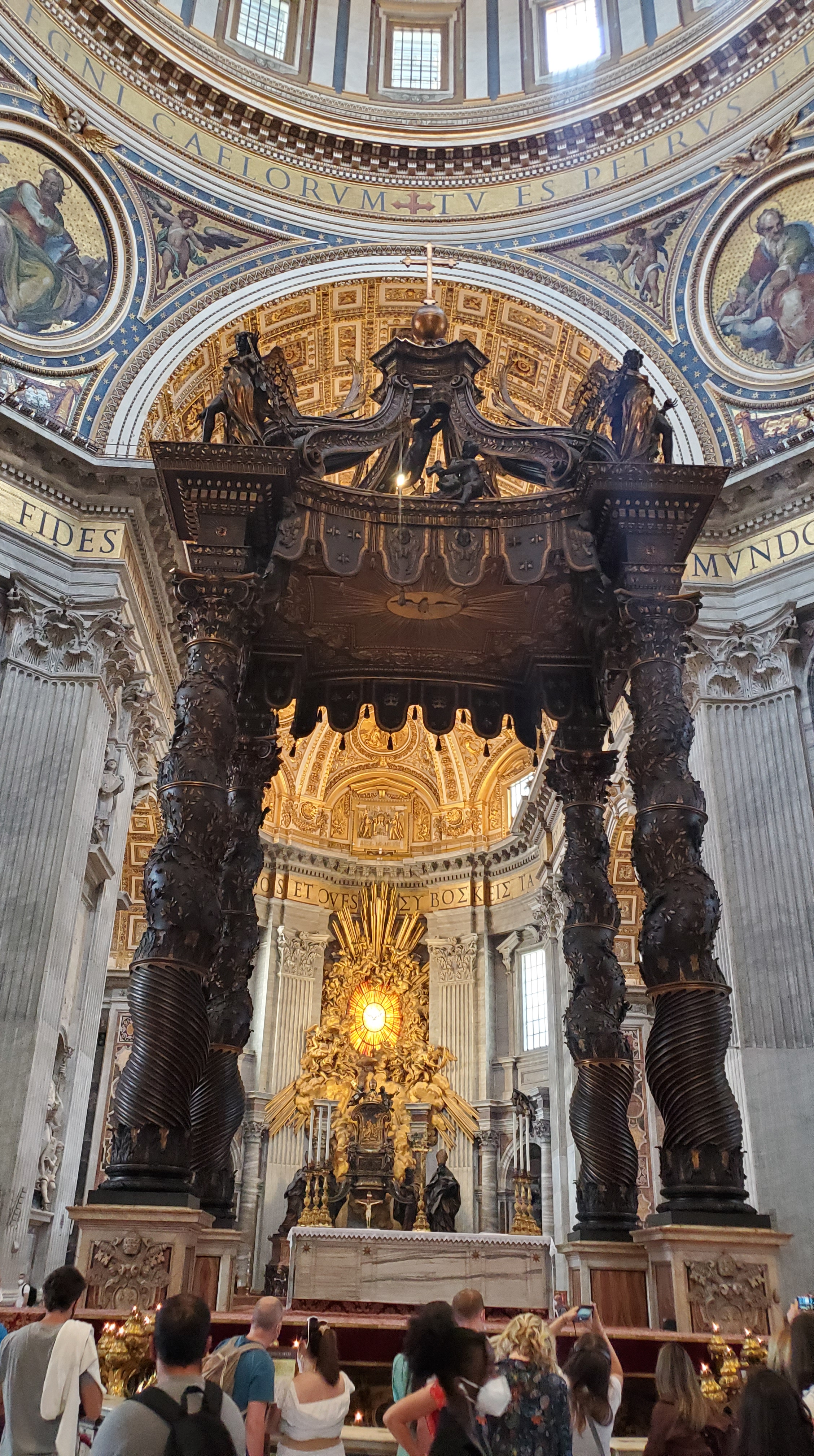 The Chapel shoots you out away from the third stop: St. Peter’s Basilica, the largest church in the world. It is enormous and I actually liked walking in and seeing that it was not taken up with benches, showing just how big the footprint was. I haven’t bothered to figure out what separates major (of which there are four and all are in Rome) and minor basilica (18,000 of them lurking around the world), but of course, St. Peter’s is major in every way. It is proud of its size and on the floor are plaques marking how other enormous churches stack up. I will admit that the art isn’t dreary; the basilica is light and airy, and it felt more uplifting than heavily sacred.