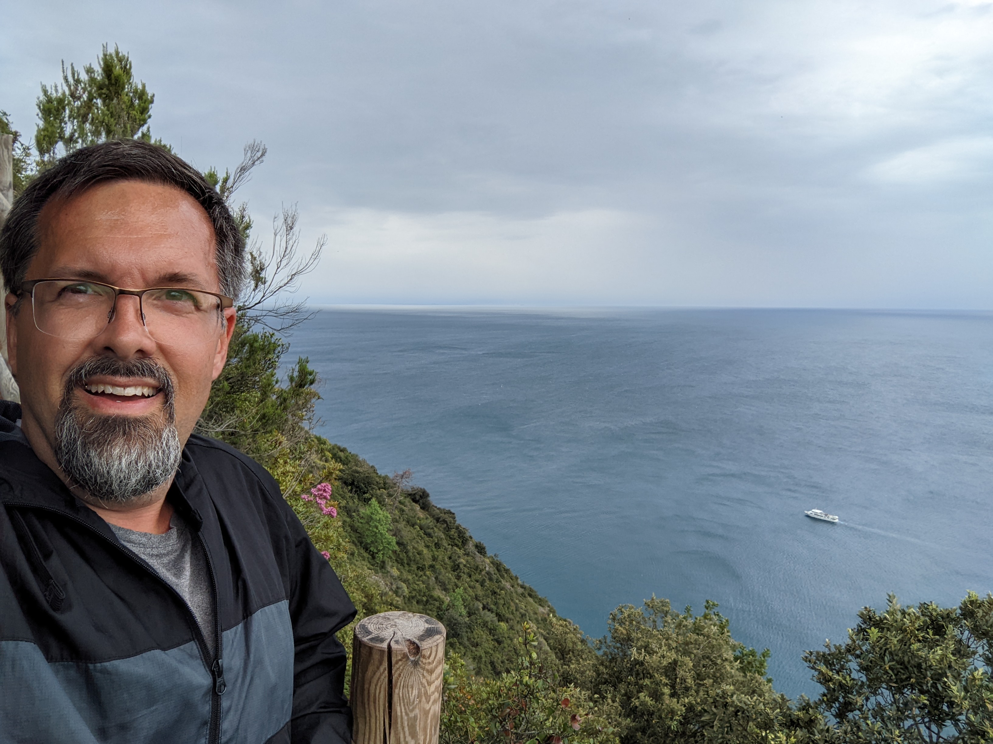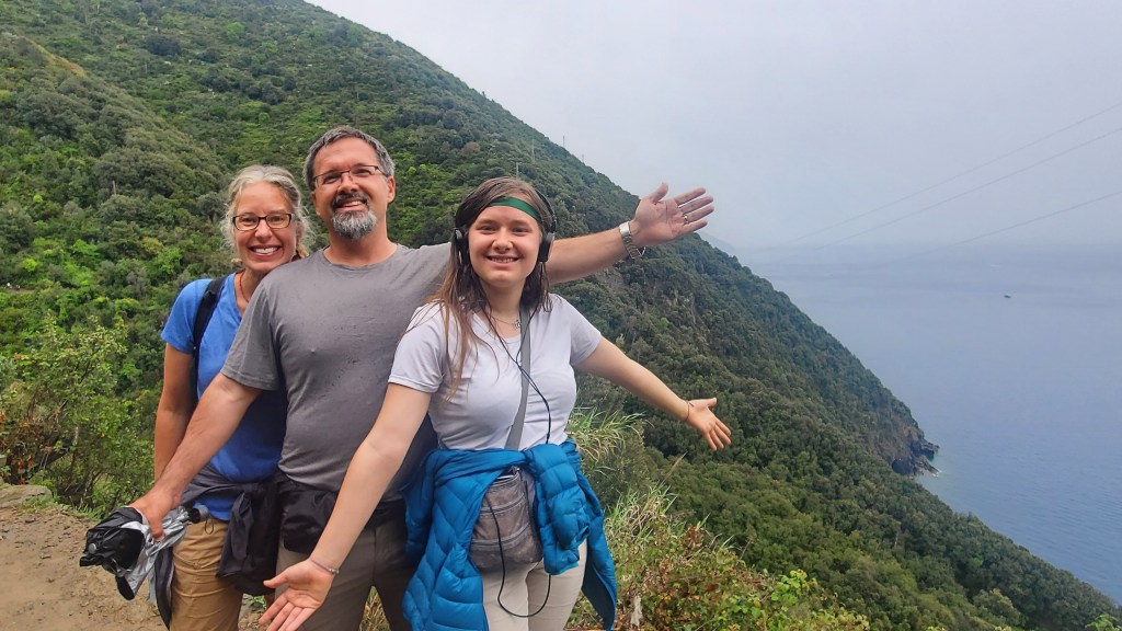 Our of cursory politeness, I invited Wes and Piper to join us. Then Kyla, Dwayne and I set out to conquer Cinque Terre on the drizzliest day of our stay. I prepped for this, realizing later that I had just become my father, with practical convertible easy-dry pants, a rain jacket, my sun-rain-mosquito-netting hat, and no style.