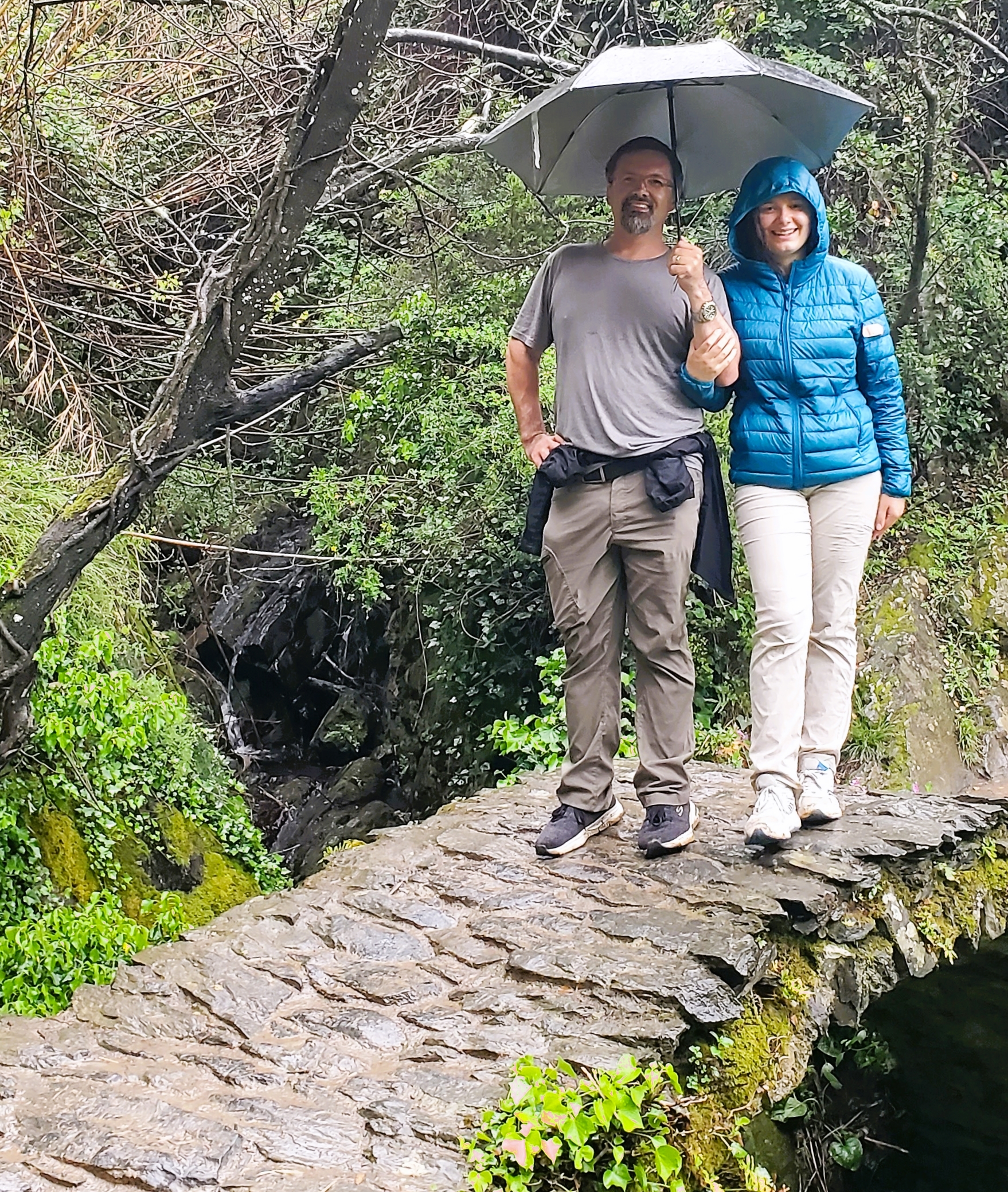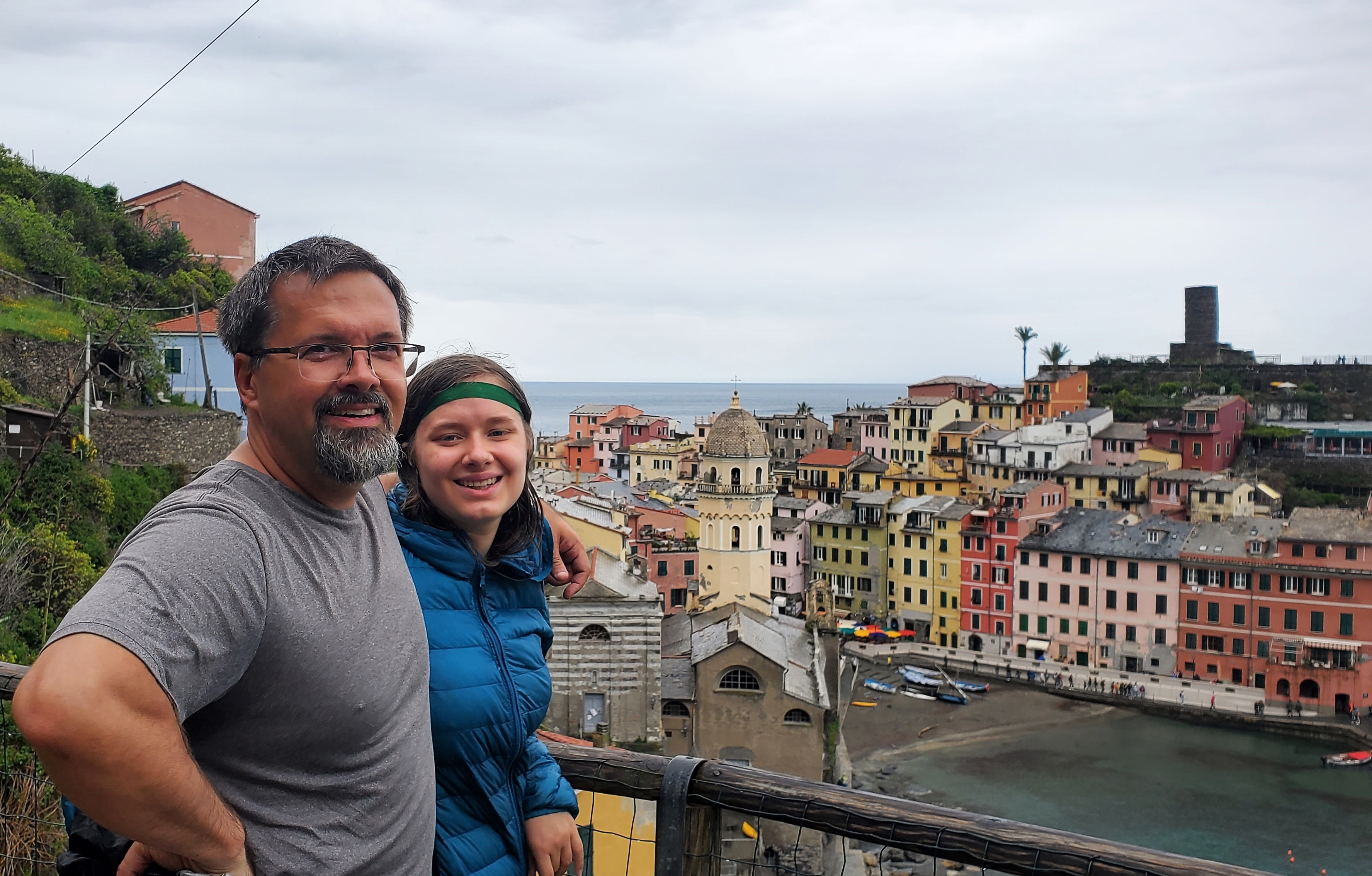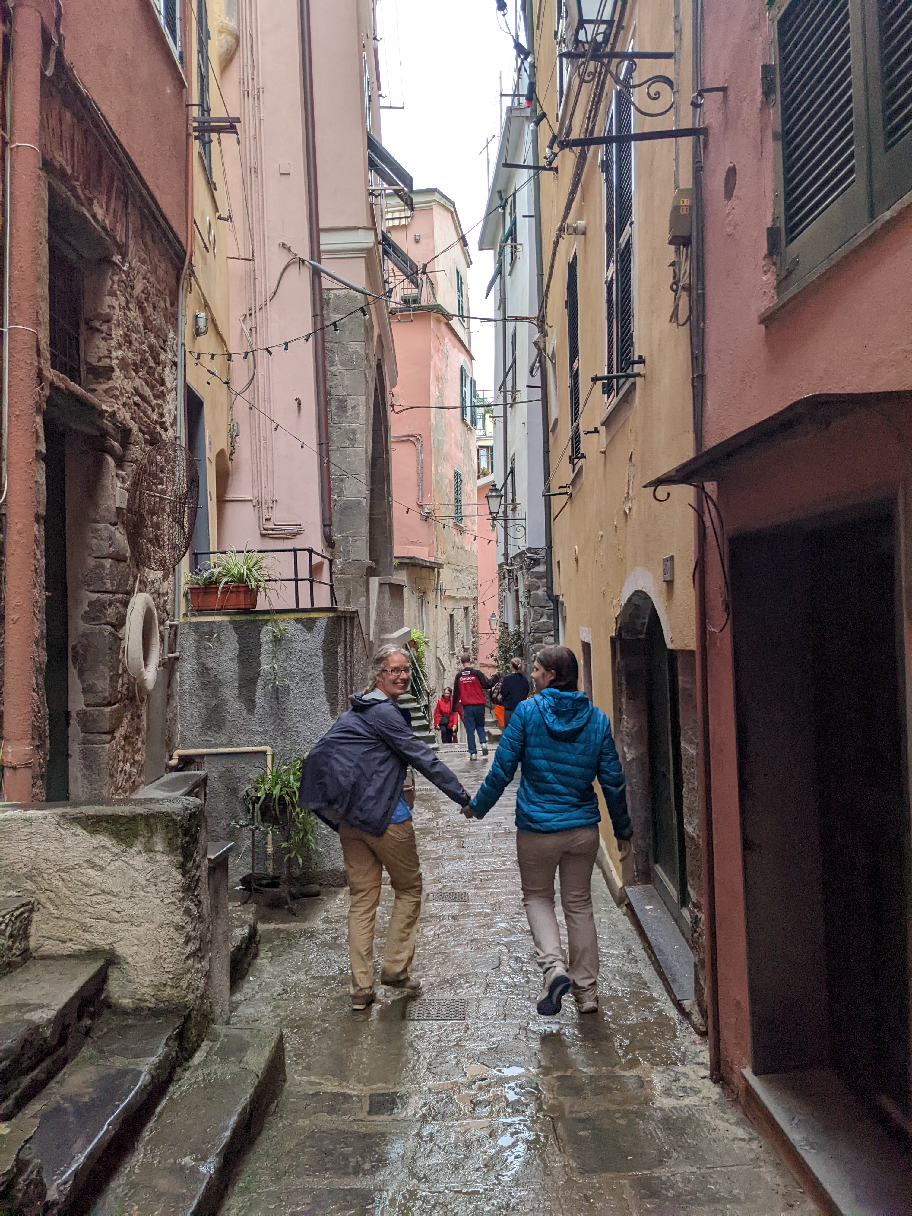 Is Cinque Terre a hike with amazing views, or great views you trek to? Either way, our rocky up-and-down path took us past waterfalls, through vineyards, orange and lemon groves, treescapes, over arched stone bridges, and up cliffs overlooking a turquoise Mediterranean where, I swear, I could almost see fish swimming. The paths included lots of steps and rocks, which kept the mud down. It took us less than 2 hours to get to the next town, which was a great place to have focaccia-as-street food before heading to the next town, which was oddly both more kilometers and less time. We took a break from the rain by calling it lunchtime, so I could pour over the maps and choose the next route as a workaround for the next two closed main paths.