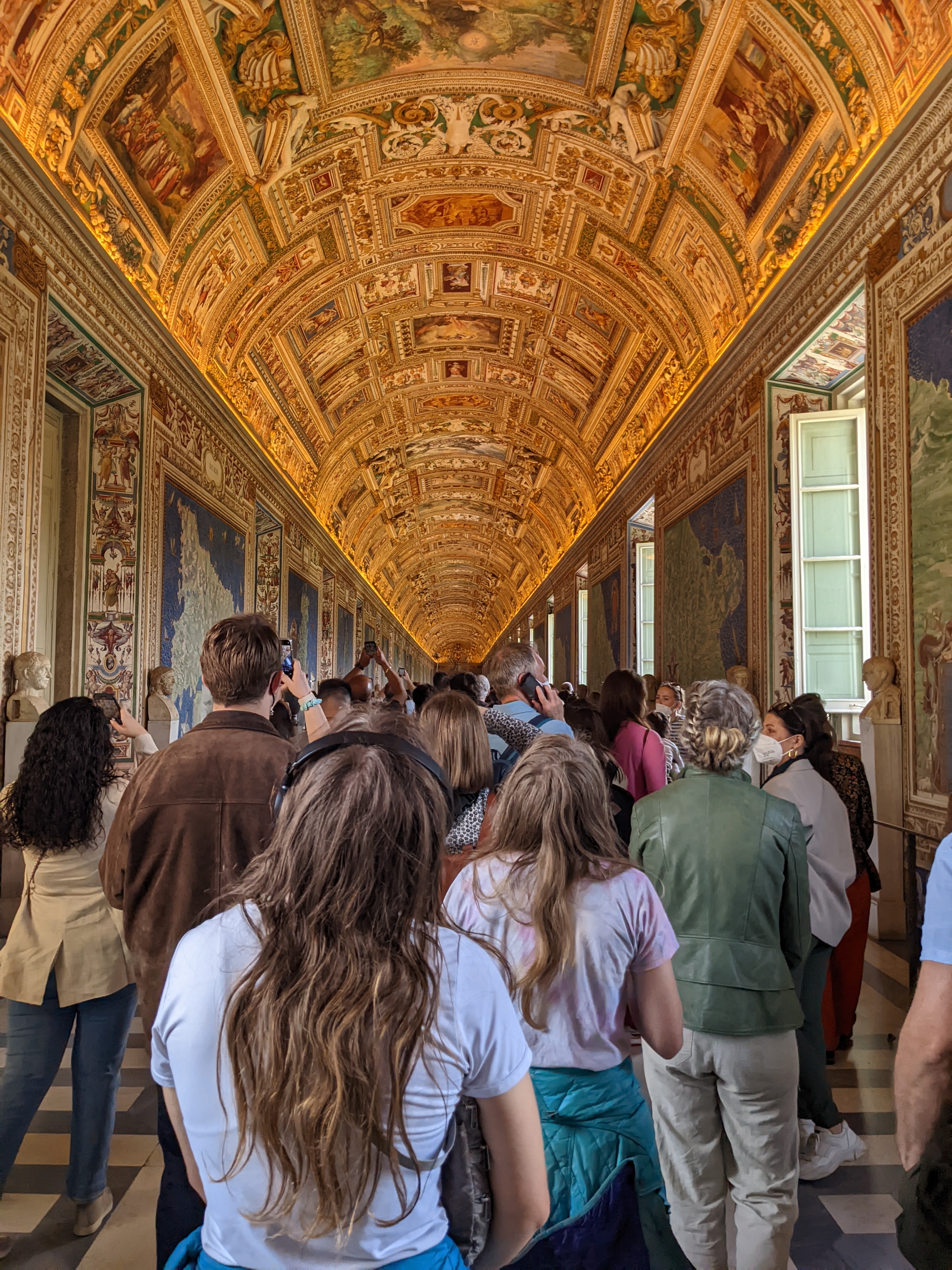 The smallest country in the world has the second-largest museum, after the Lourve, indicating the power, reach, and wealth of the papacy over the centuries. This niggles a factoid loose, that part of the golden extremism came as a counter to the plainness of Martin Luther’s Protestantism. It is easier to wow people with mighty buildings and a sensory overload of ostentatious accouterments. (Oh, crap, did I just revisit America, 2016?!?)