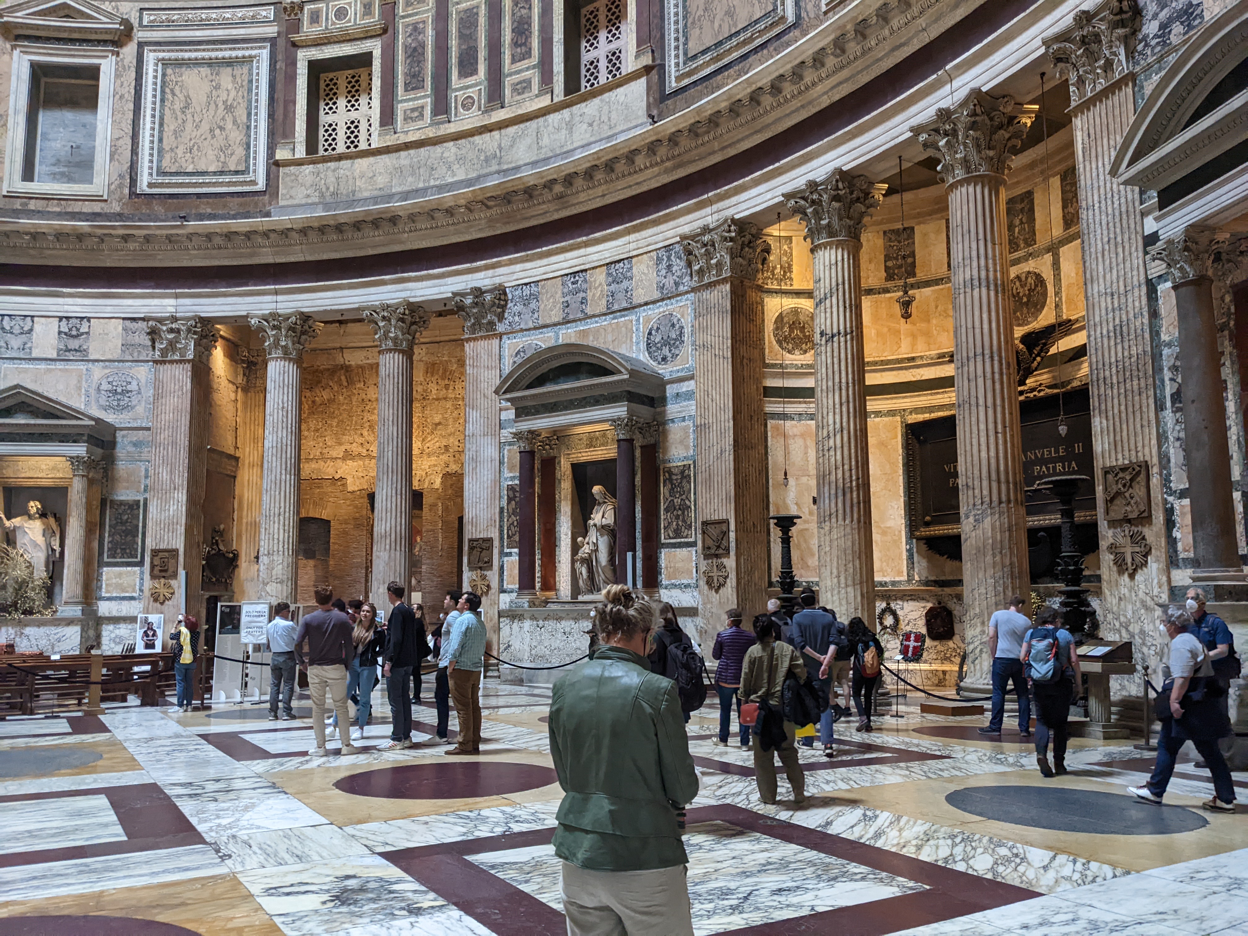 Observation #5: The Pantheon [all + gods] is worth seeing and it’s free. This building is the most intact structure of ancient Rome since its rebuild in 1AD because of its continual use, first as a Roman temple and then, in the 7th century, a Catholic church. The columns in front belie the circular structure of the inside. The dome is open (final picture) to allow light long before electricity was an option. And yes, it absolutely rains through the open ceiling, making useful the many floor drains. I believe the first two Italian kings are interred here, but I found it interesting that this is also the final resting place of the Raphael (under Mary & Child in first picture).