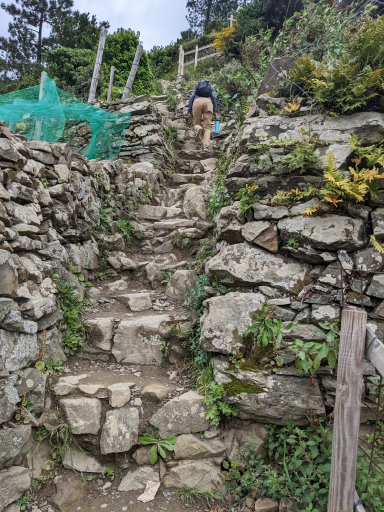 Kyla was a trouper who did about 7.5 km on the longer, tougher trails with us through rain and mud. The girl knows when to quit while she’s ahead, though, and took the train by herself back to the hotel*, and Dwayne and I rode to the next town to avoid the closed 3rd segment. But between the last two towns, there was a 1.4km trail that I wanted to do to complete our Cinque Terre day. The map rated it “moderate”, the same as our first two trails, so easy-peasy. Right?